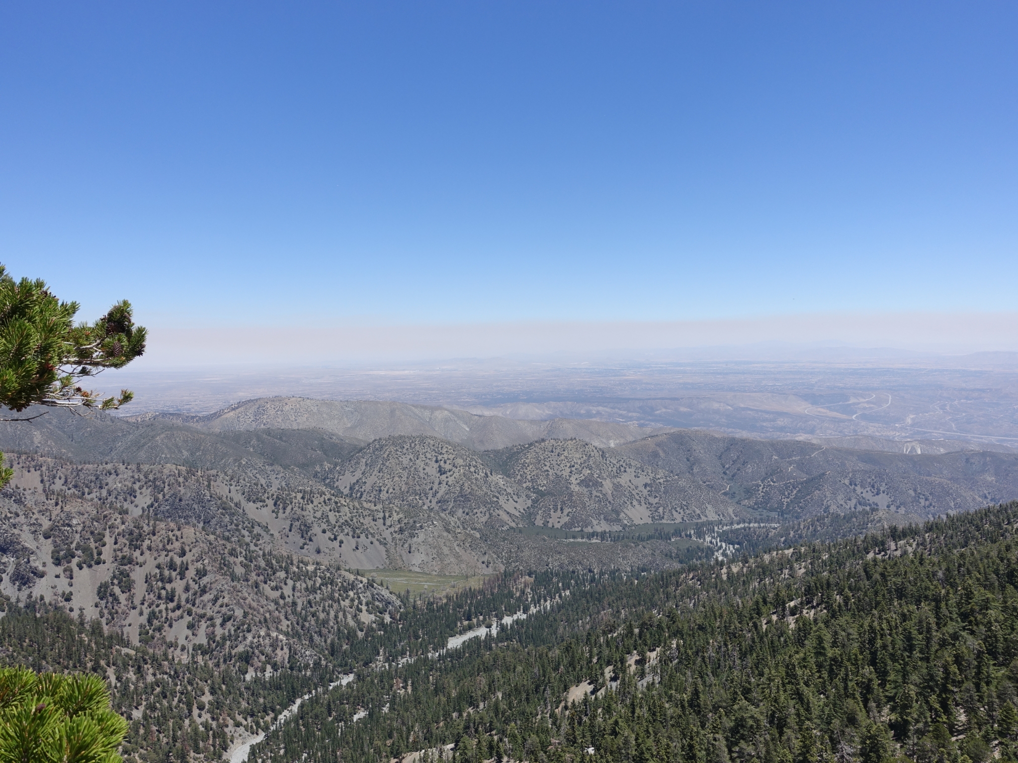 ![]() 15 A look down to the valley on the other side. I'm not sure what those large meadow areas are, but they look like they're worth exploring. You can see the air below is still tainted by the wildfires in the area. |