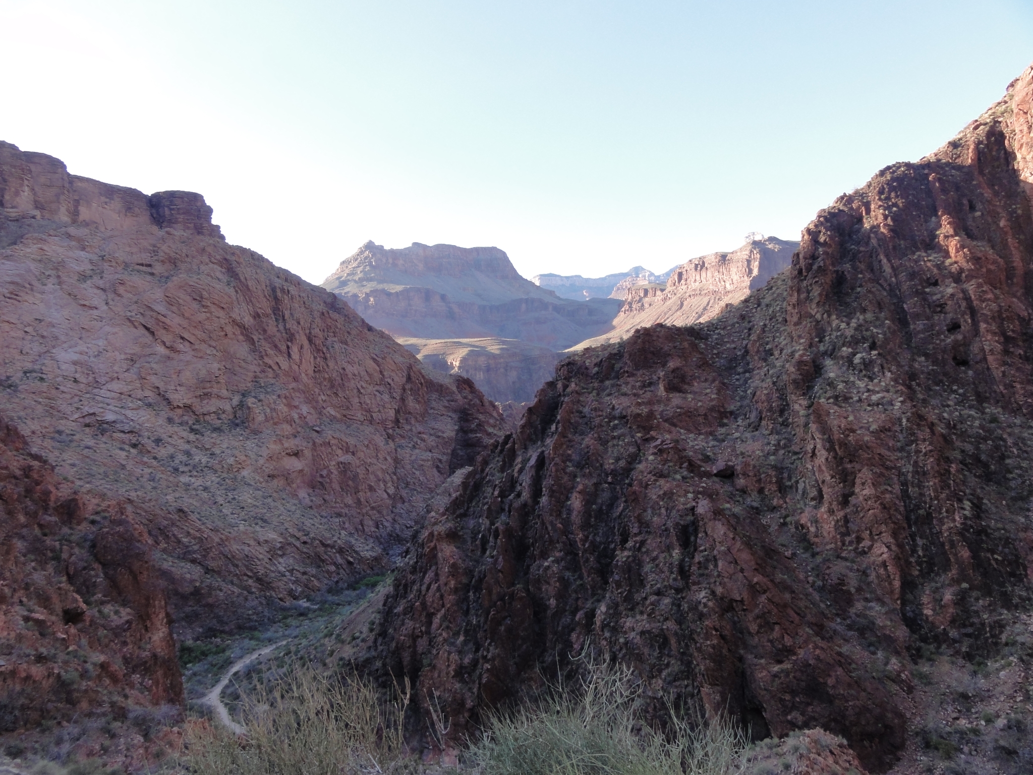 ![]() 6 Leaving the river, the trail follows Pipe Creek for a while. This is the first clear glimpse of the South Rim, and it looks a long ways away! |