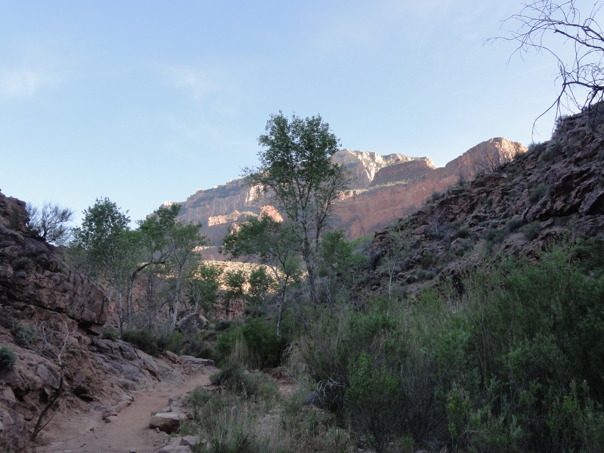 ![]() 21 Getting ready to leave Indian Garden and make the final ascent to the South Rim. The flat trail through Indian Garden has given me a little bit of a second wind, but I still have 4.6 miles and about 3000' of gain to go. Looking at the canyon wall, it's hard to imagine there's anywhere a trail could go up that. |