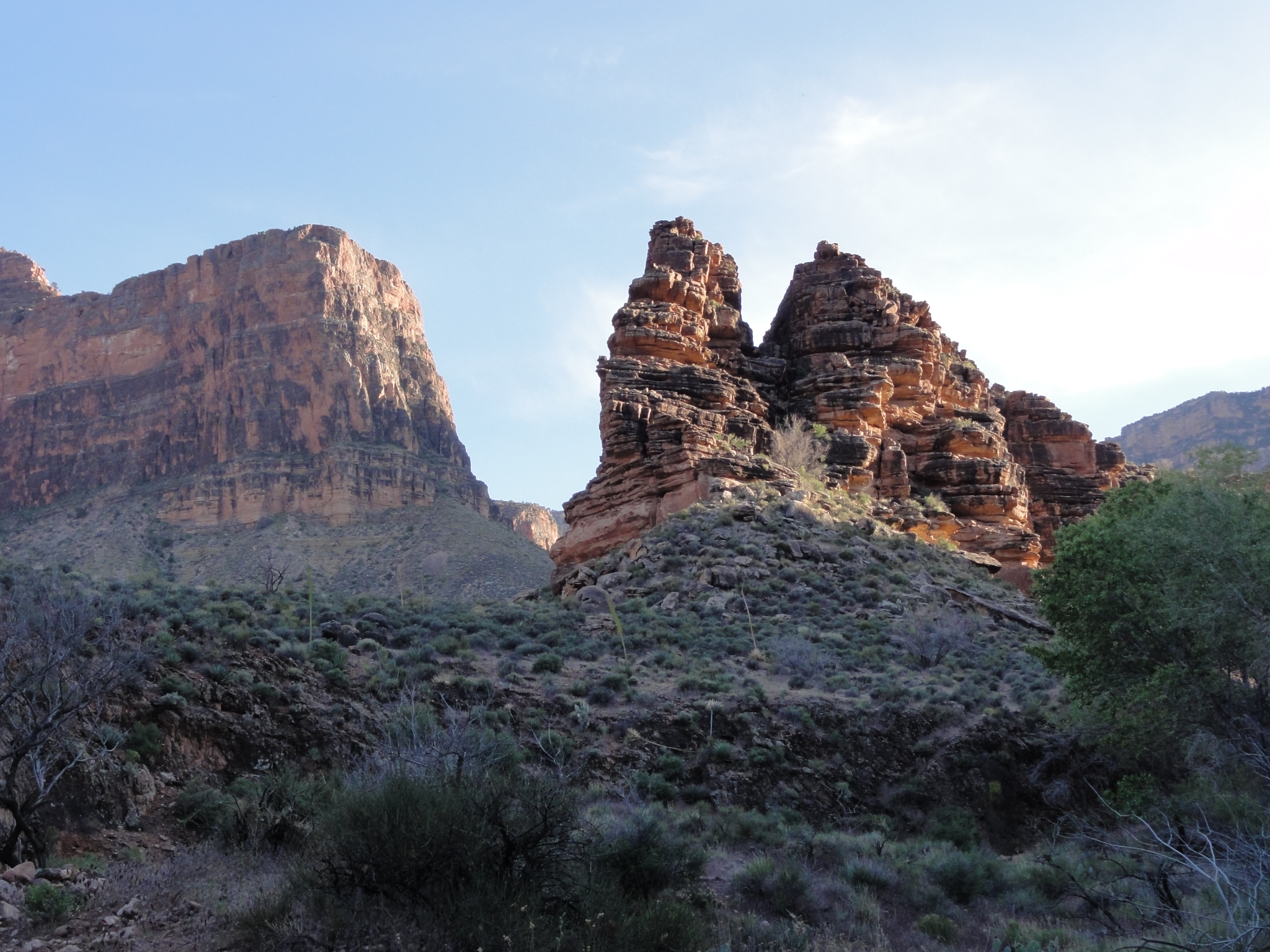 ![]() 18 Approaching Indian Garden, a lush oasis in the middle of the Grand Canyon. Similar to Roaring Springs, there are several springs that form here when water seeping through the rock layers hits an impervious layer. This area was farmed by the Havasupai Indians as early as 1300 AD, and was used by prehistoric humans before that. |