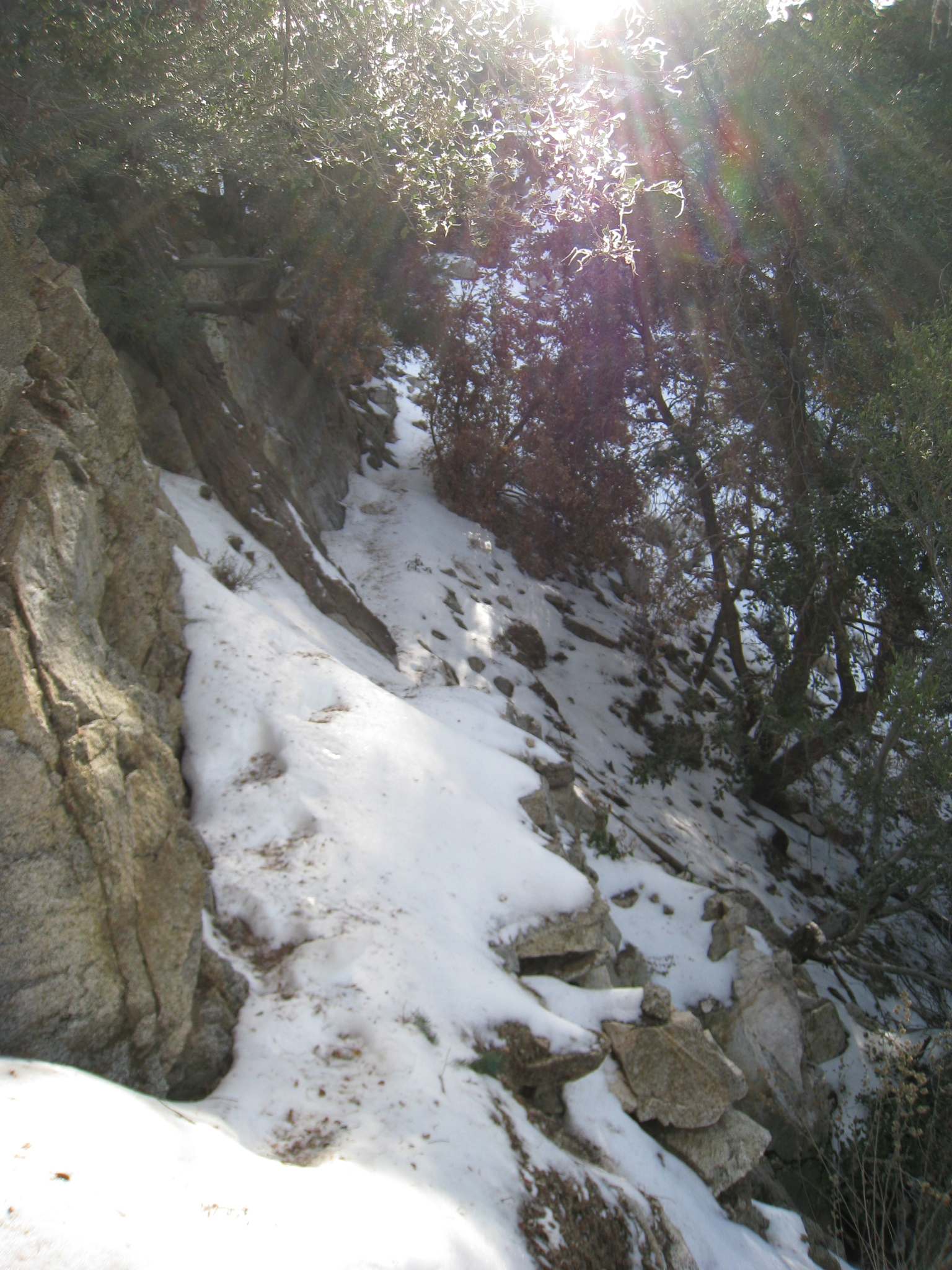 37 Yes, that is the trail. And no, I am not able to run through this section. This is a slow hike on a narrow snow covered ledge with a steep dropoff to your right. Awesome!