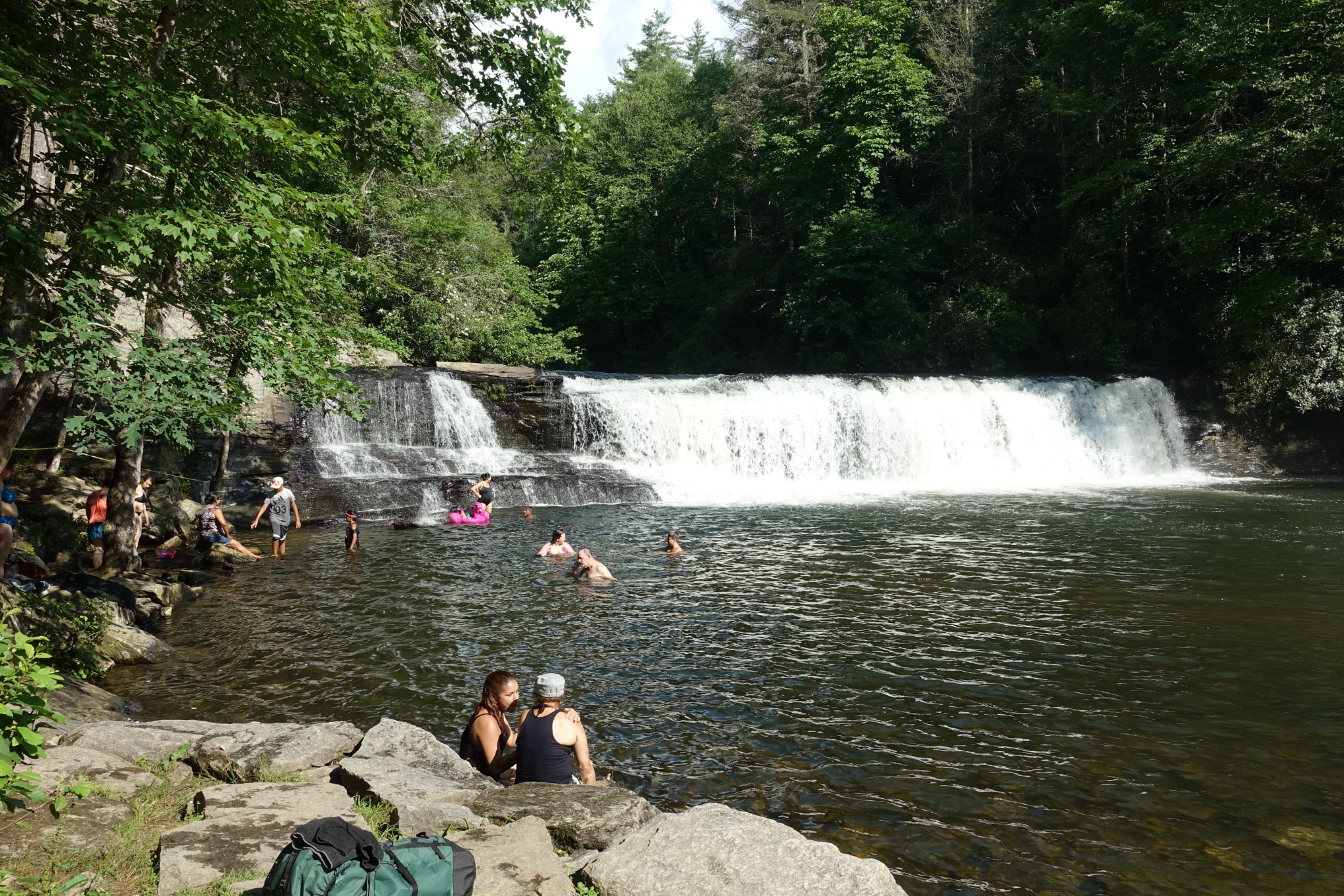 12 It's a short waterfall, but still carries an impressive amount of water. It's an extremely popular swimming hole in the hot weather, and it's packed with people.
