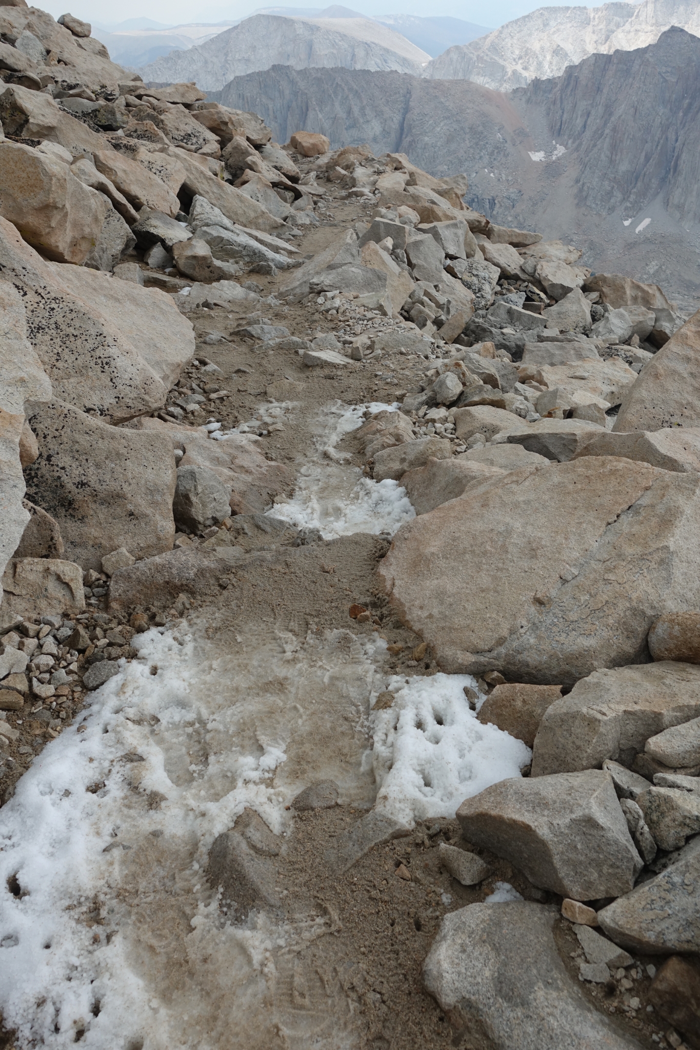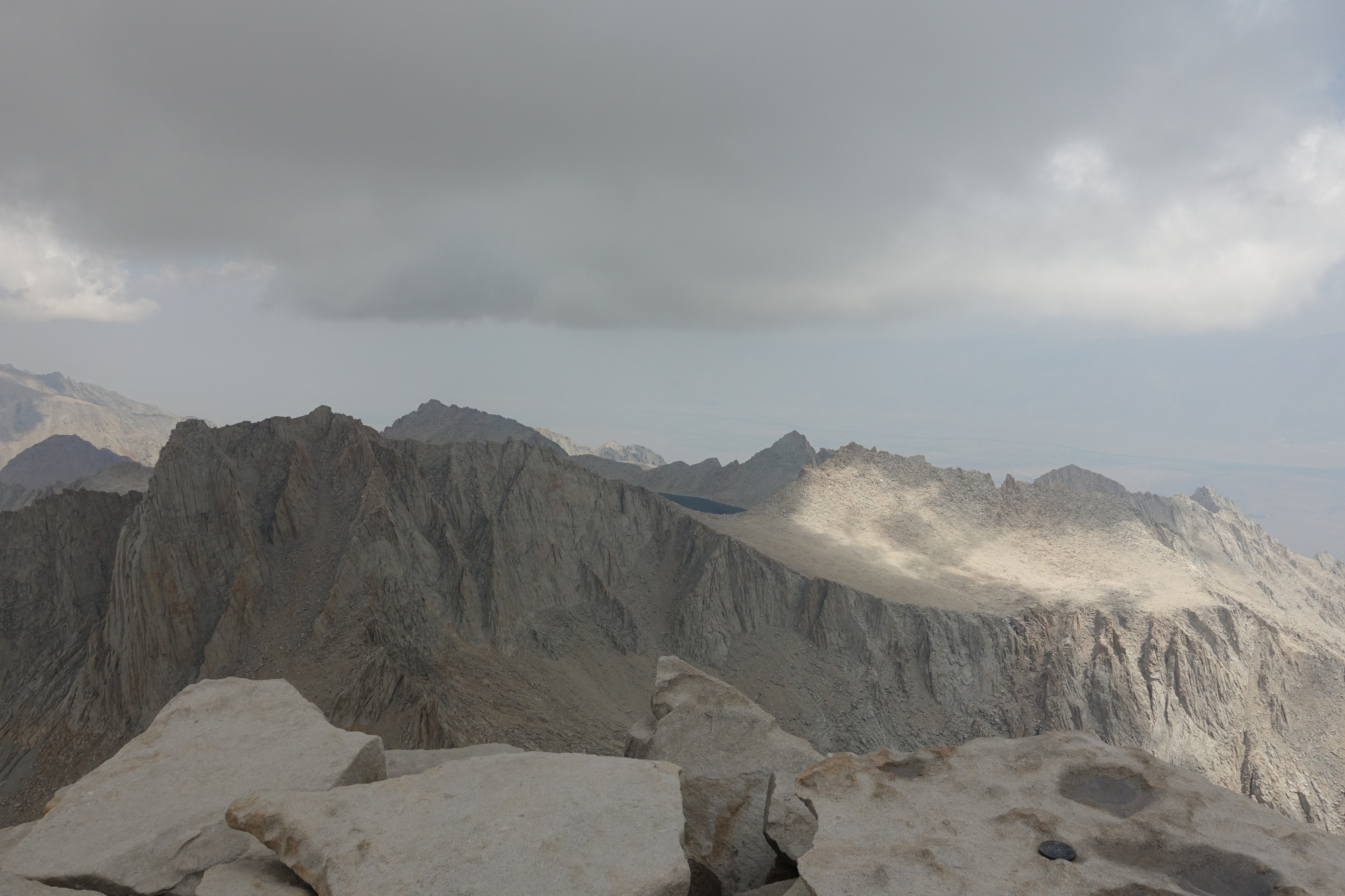 34 The view Southeast from Trail Crest. I decide I'm not going to let weather stop my 24hr challenge if at all possible, so I make a mad dash to the summit. I basically ran from Trail Crest to the summit, blowing by people, and not stopping for a single picture. The trail here is rugged and narrow with steep drop-offs covered in snow patches, so there was a limit to how fast I could go even at full speed.