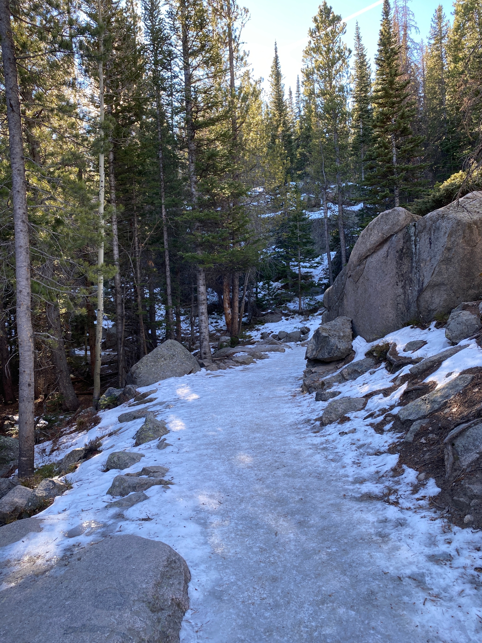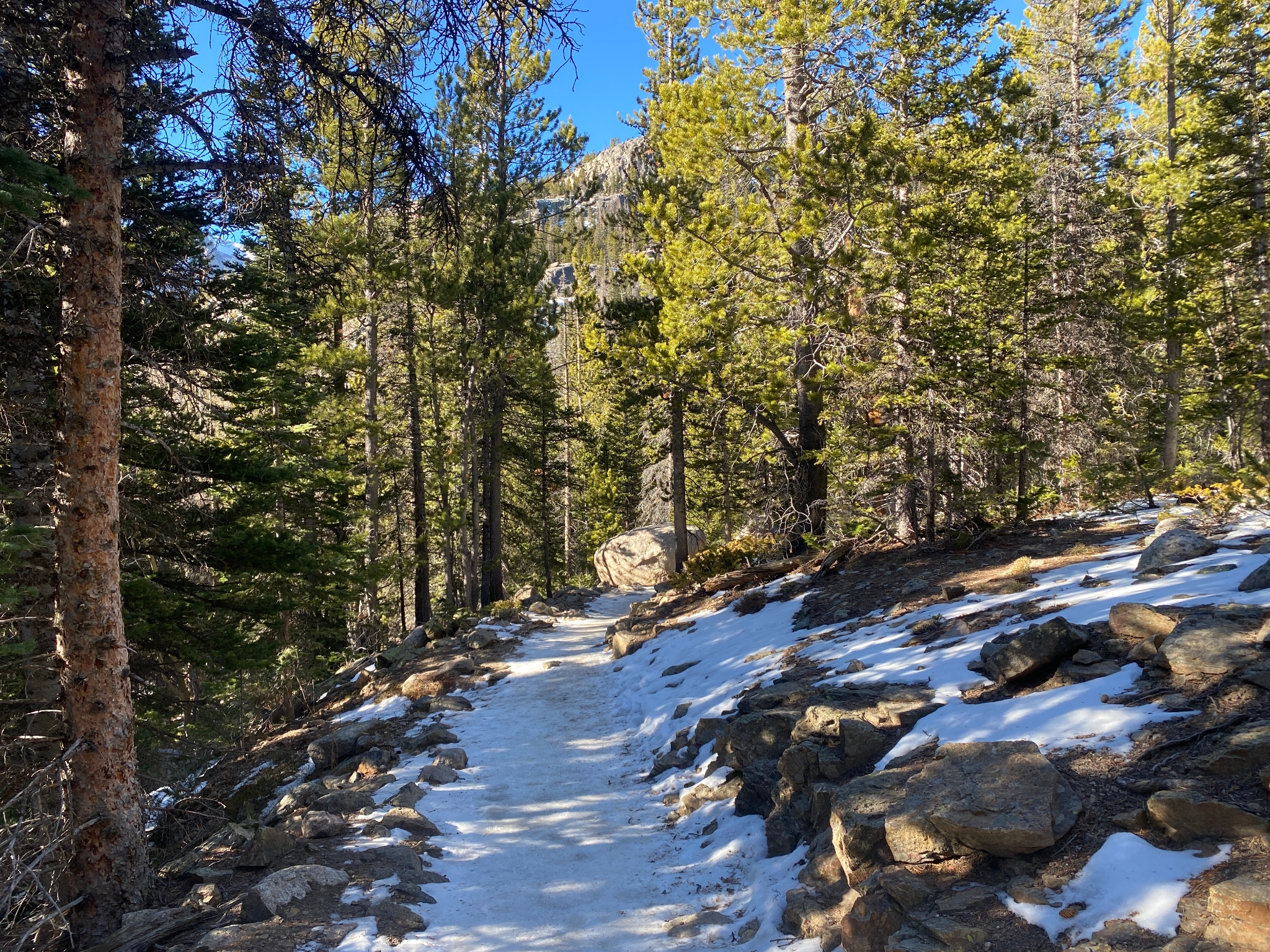 1 After making the almost 2 hour drive up from Denver, I was ready to get started at the Glacier Gorge trailhead. An extremely dry winter so far meant that there was much less snow than normal. It was a chilly but perfect morning.