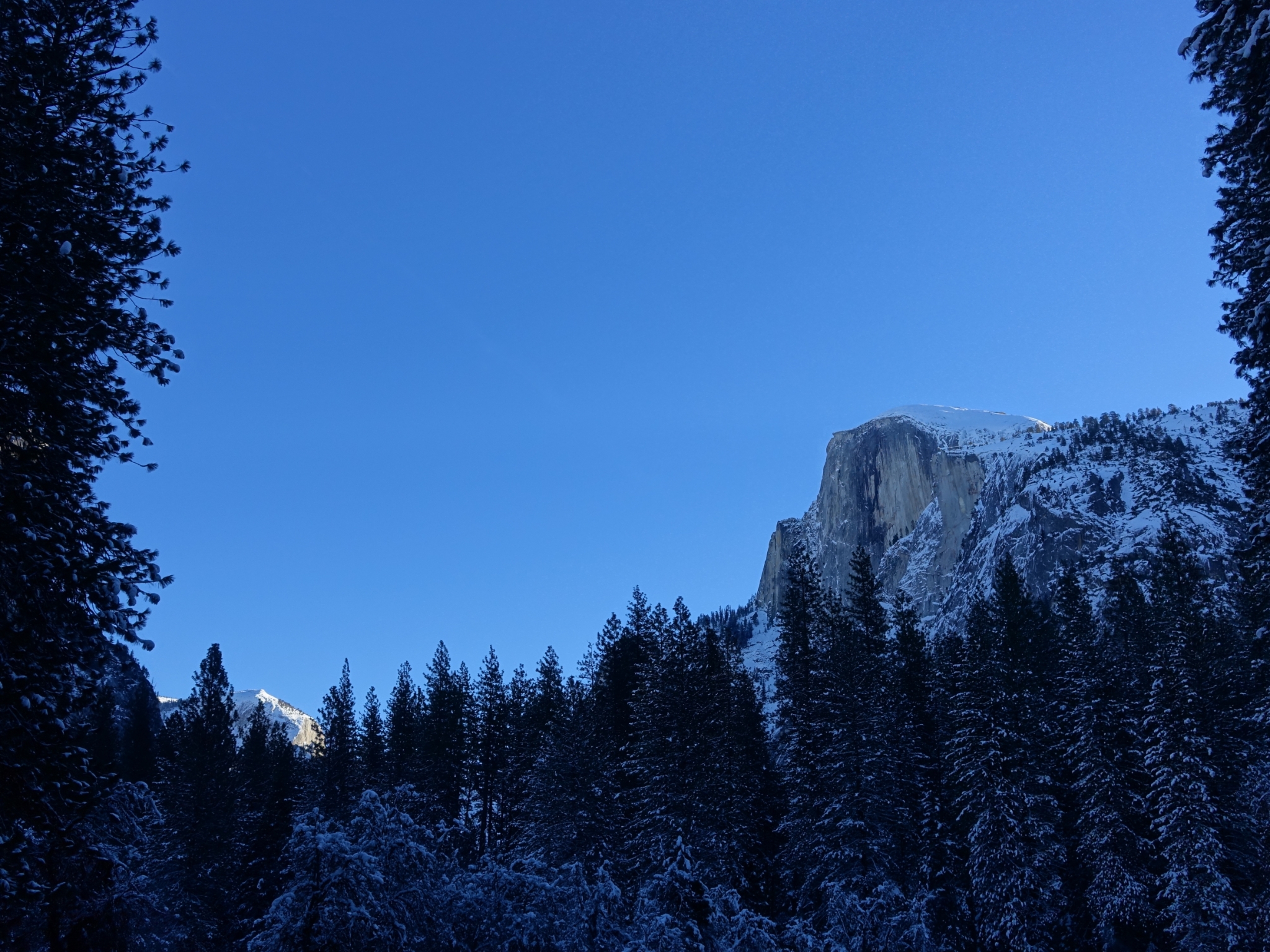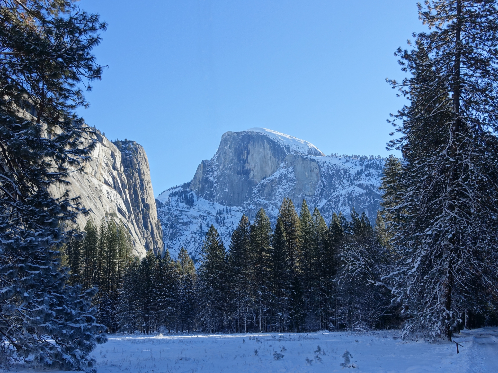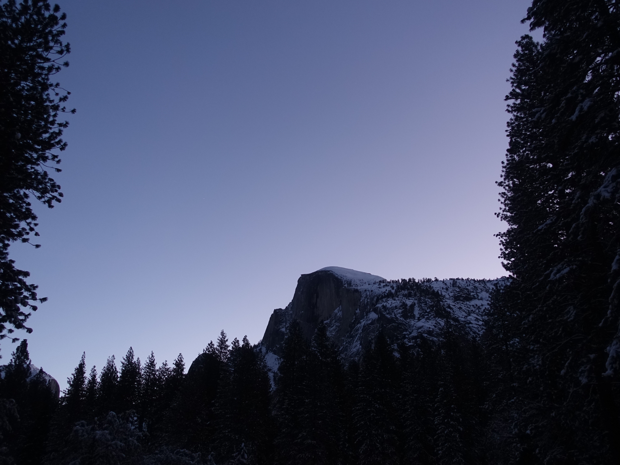 1 Half Dome against the dawn sky. We hadn't been able to get pictures of the iconic spots around the Valley loop the previous day because of low visibility in the storm. We had hoped that if we stayed the night in the Valley, we would be rewarded with clear skies in the morning. And were we ever!