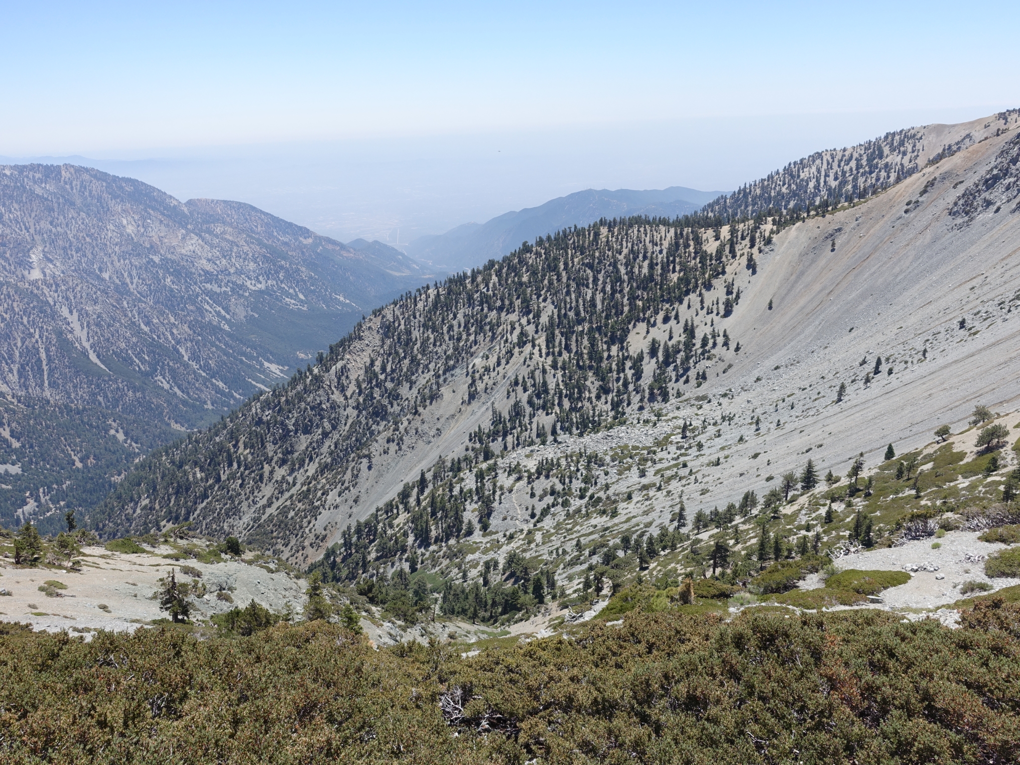 ![]() 15 A look down to the valley on the other side. I'm not sure what those large meadow areas are, but they look like they're worth exploring. You can see the air below is still tainted by the wildfires in the area. |
