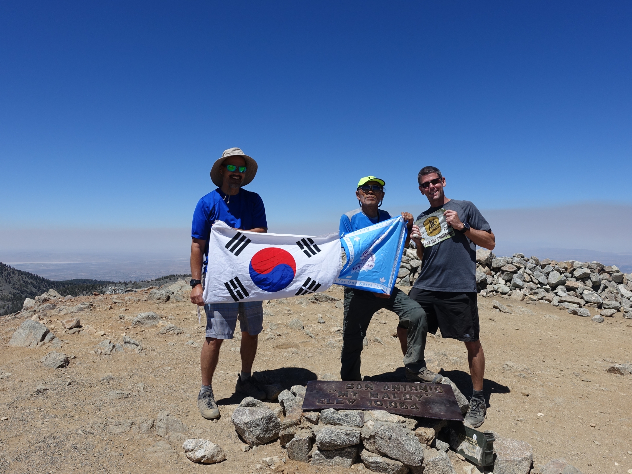 ![]() 29 As I was hanging-out on the summit, along came 79 year old super-hiker Seuk Kim again sumitting Baldy for the 11th day in a row. He insisted on another summit pic with our "flags". This time he gifted me an apple, some sort of Korean vegetable, and some gummy worms. All I had to gift him back was a raw, organic power bar and some water (he was running low). I hung out for almost an hour and half chatting with him before heading back down. |