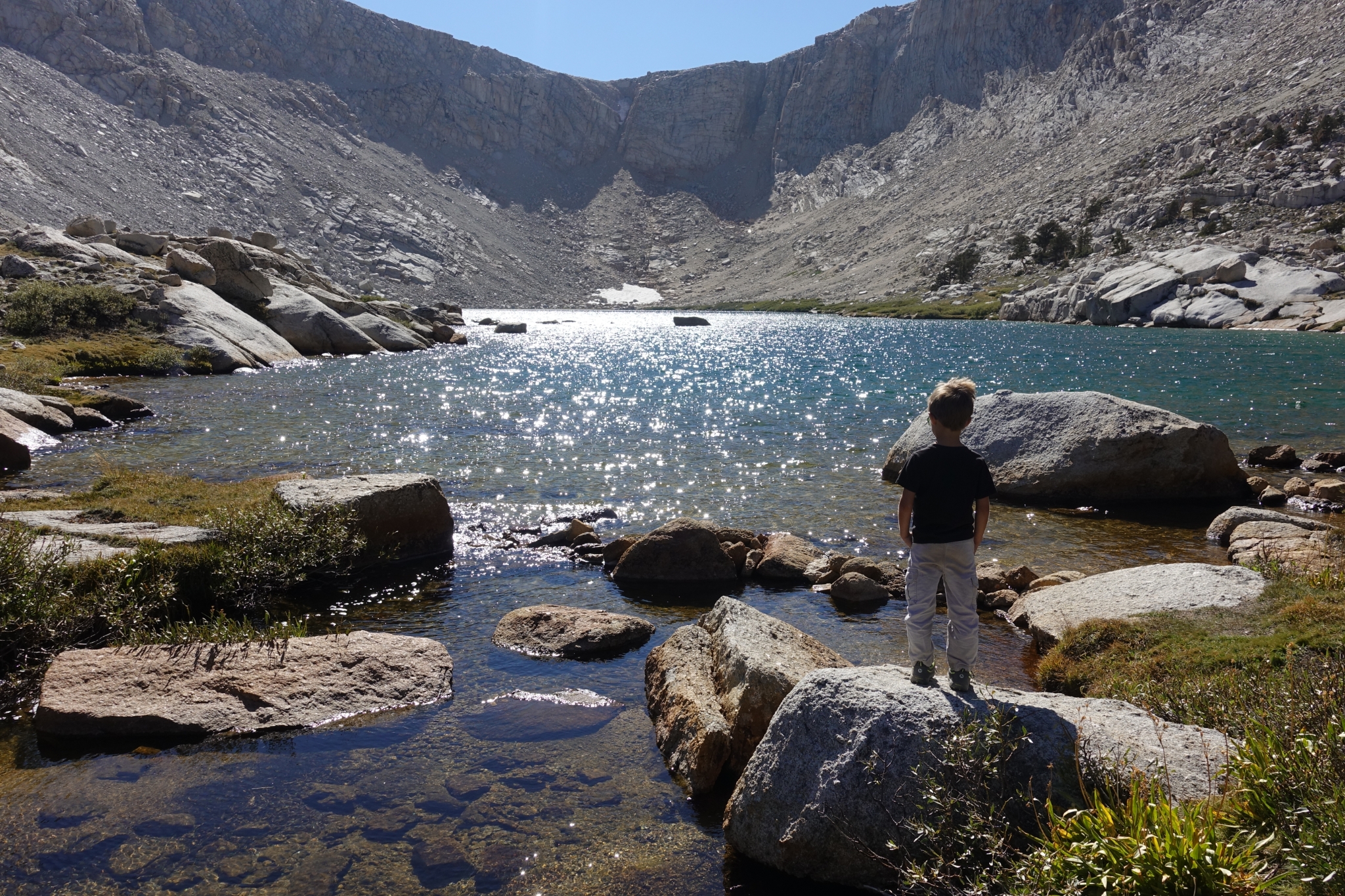 21 We arrive at Lakes 4 & 5 and take our packs off to scout for a campsite. Aidan immediately has his eyes on the patch of snow on the other side of the lake. He's never been in snow, so we decide that's first thing on the agenda for tomorrow morning!