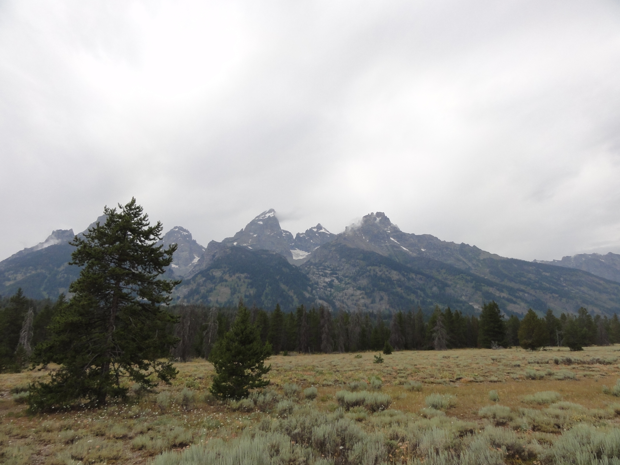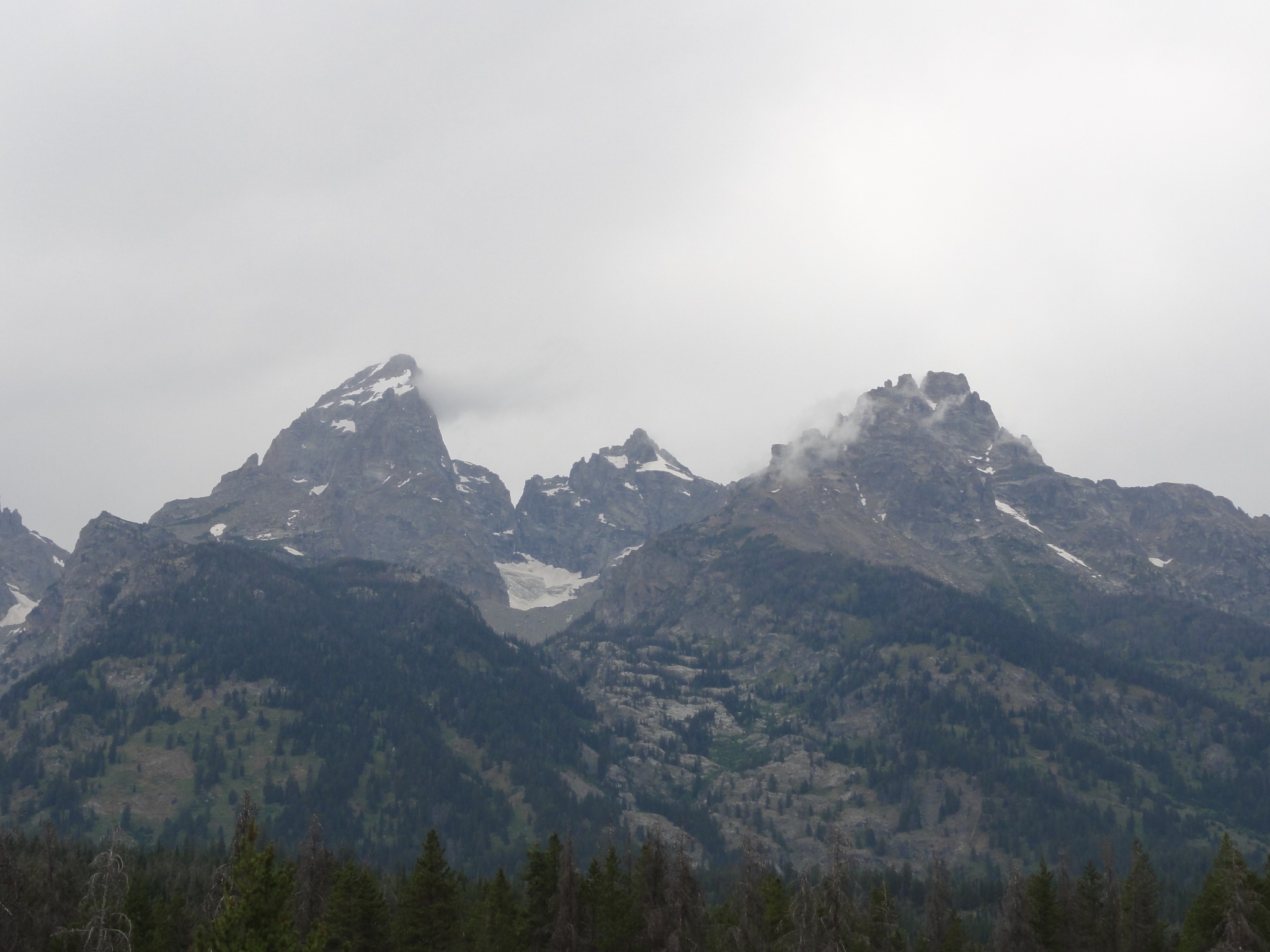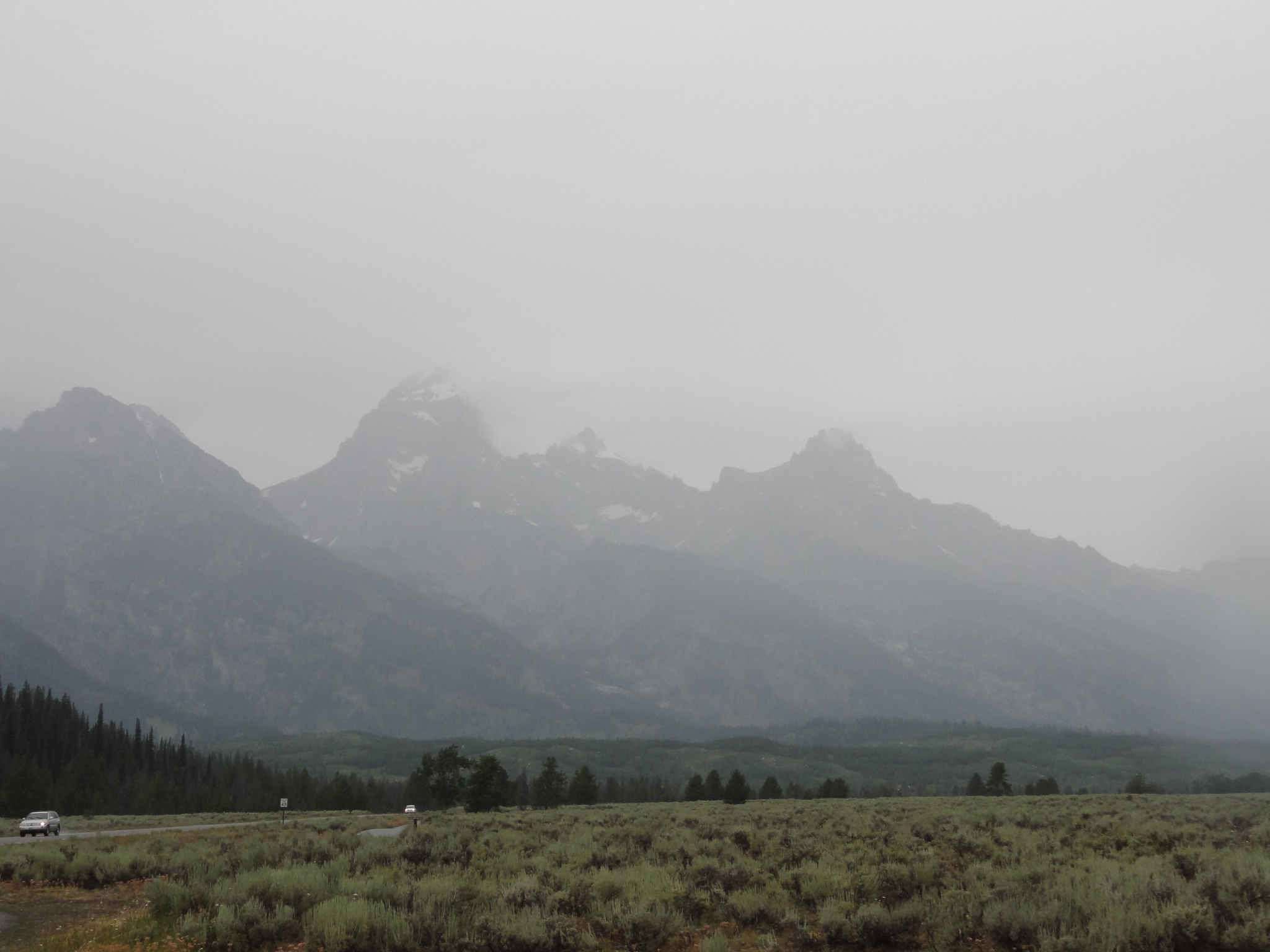 19 Back on the main road at one of the many turnouts with picturesque views of the Tetons. It has been raining for most of the day, which doesn't bode well for weather conditions for the hike.