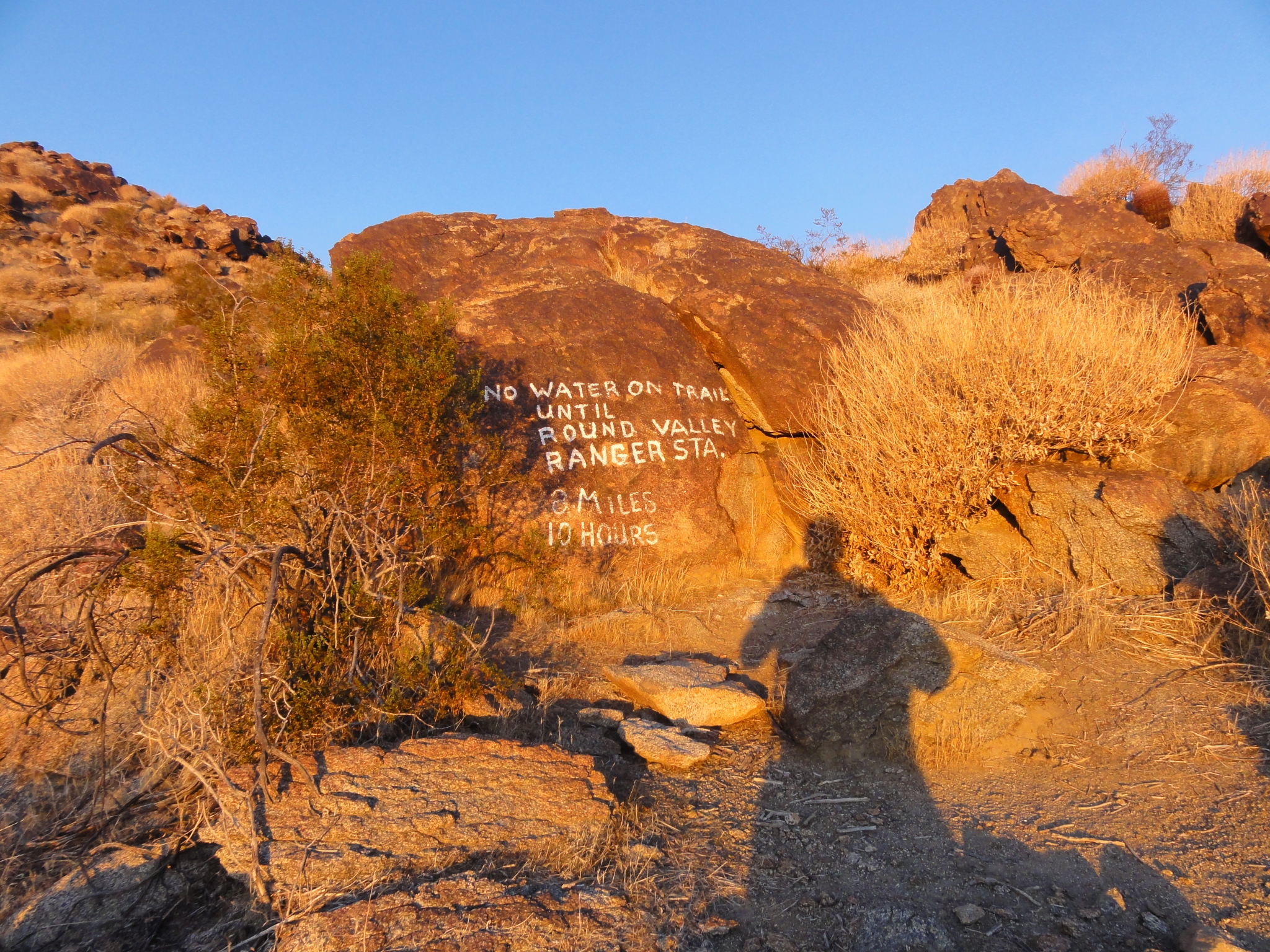 ![]() 27 The "Long Valley 8 miles, 10 hours" rock sign illuminated only by the moon and the lights of Palm Springs. It is actually much lighter than the camera is able to capture. We hiked for well over an hour in the dark with no headlamps. The full moon, together with the tennis courts, baseball stadium, and the rest of Palm Springs, provided just enough light to hike by as long as you kept your eyes focused on the ground. If you looked out at the city at all, you would be blinded for several seconds until your eyes re-adjusted. |