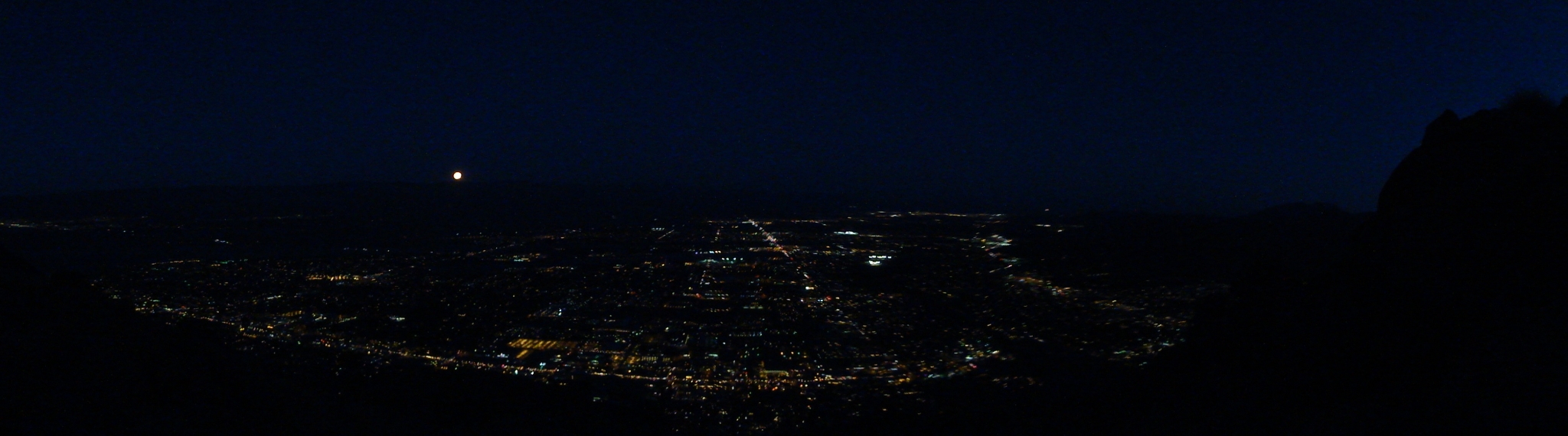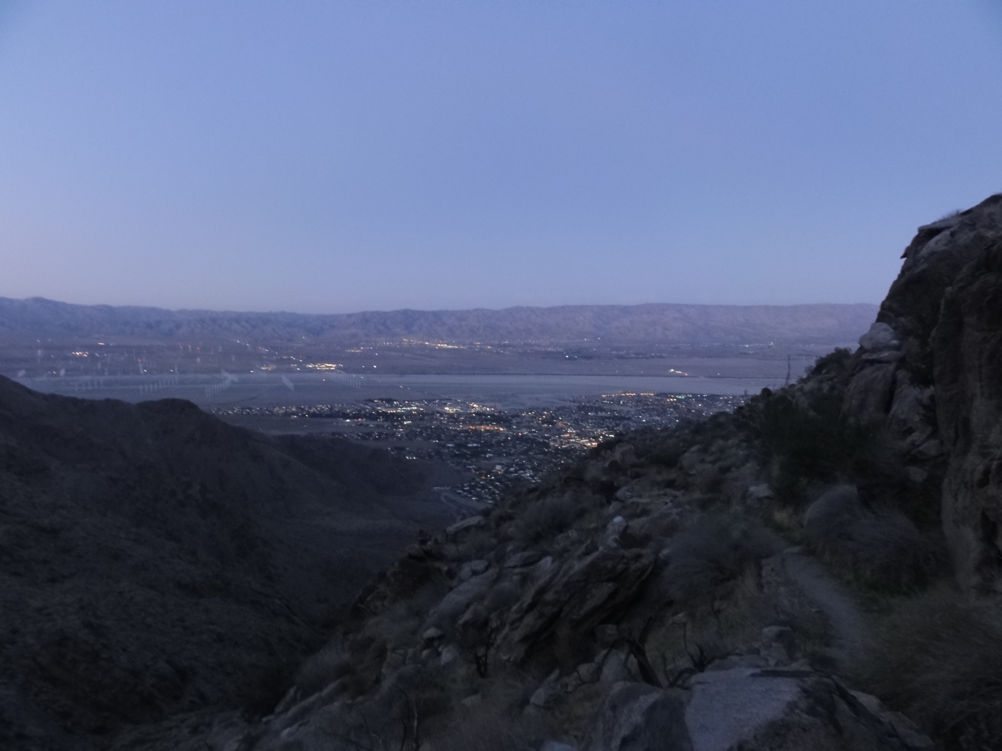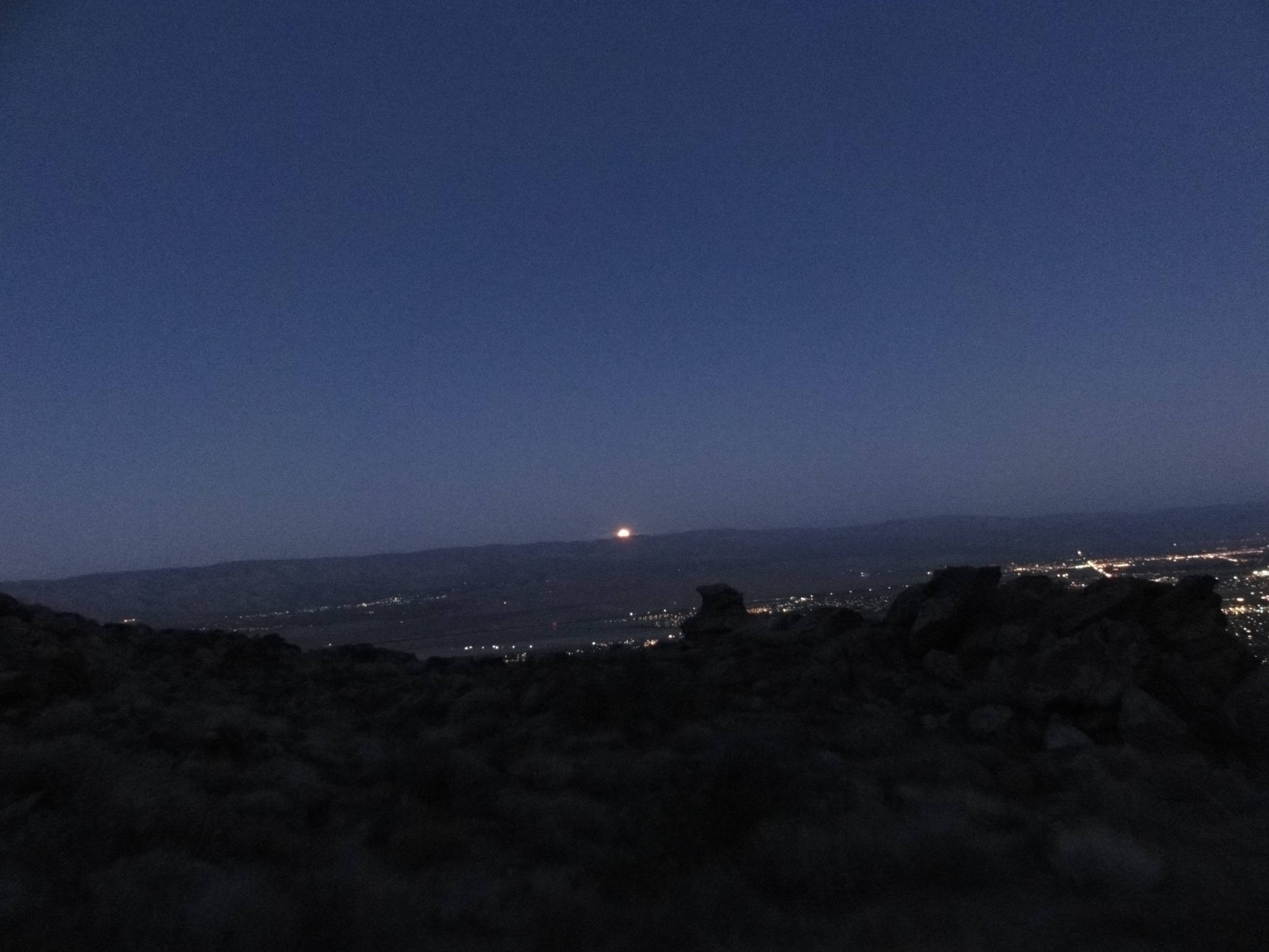![]() 28 Panaromic view of the full moon over Palm Springs. A major goal of this trip was to determine how hard the trail is to follow on the way down, particularly in the dark. Overall, it wasn't too bad. We lost the trail briefly though at the Ramon trail junction (at the picnic tables) and finally had to put on the headlamps. You really can't get too lost with the city right below you, but it would probably take a lot longer to get down doing it off-trail. |