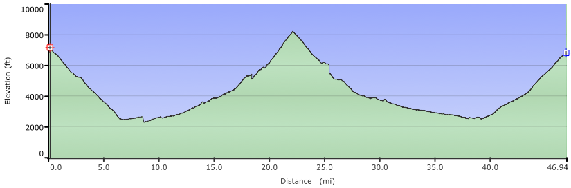 4 Elevation plot for the full round-trip, with the North Rim being in the middle and the South Rim being on both ends. GPS data is from the Garmin Oregon 300.