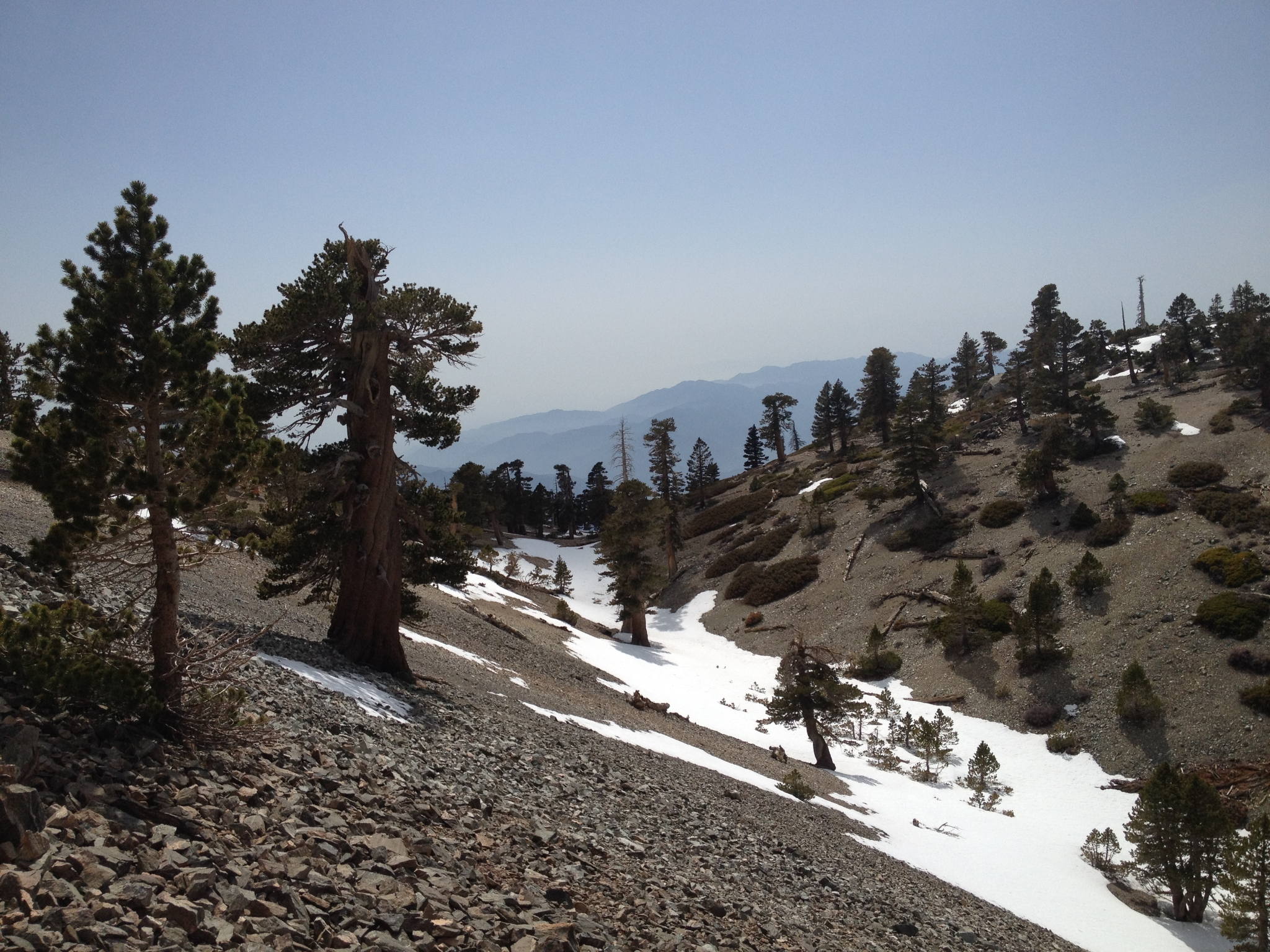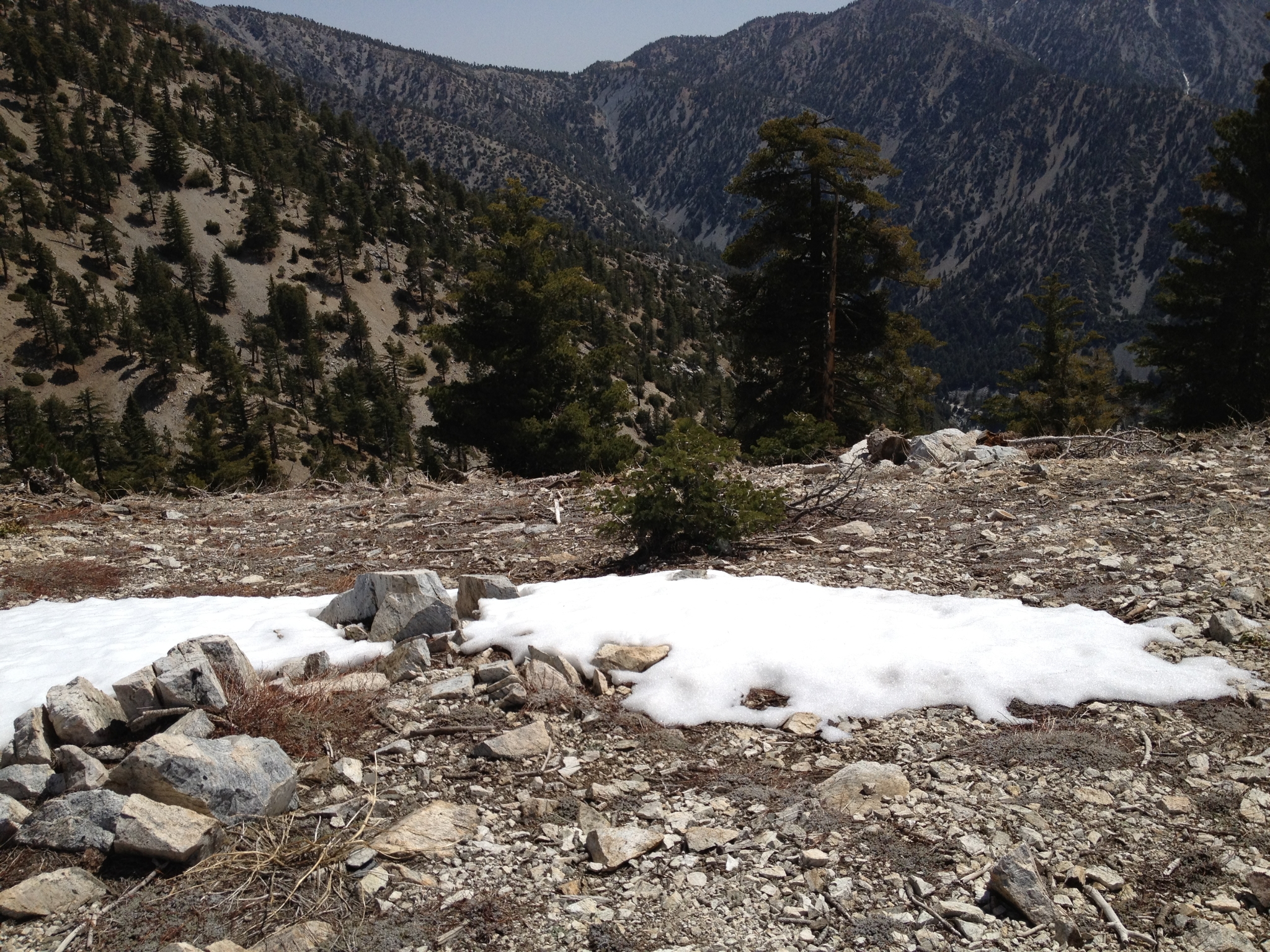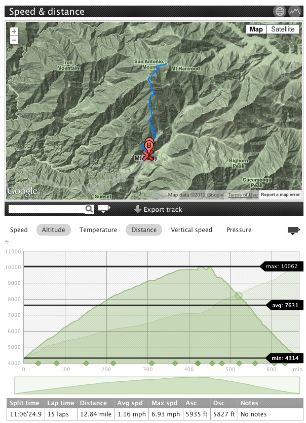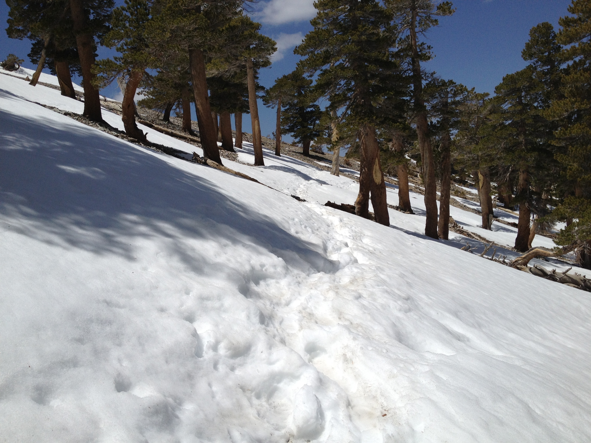 4/29/12 A trip on the Mt. Baldy trail up the front side of Mt. Baldy. Though it's maybe not quite as difficult as the backside route, it's unquestionably the second hardest way to summit Baldy. 6000' of gain in 13 miles averaging almost exactly 1000' per mile the whole way to the top.