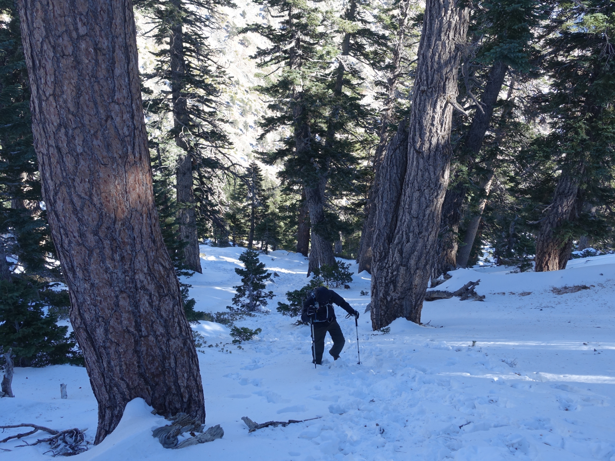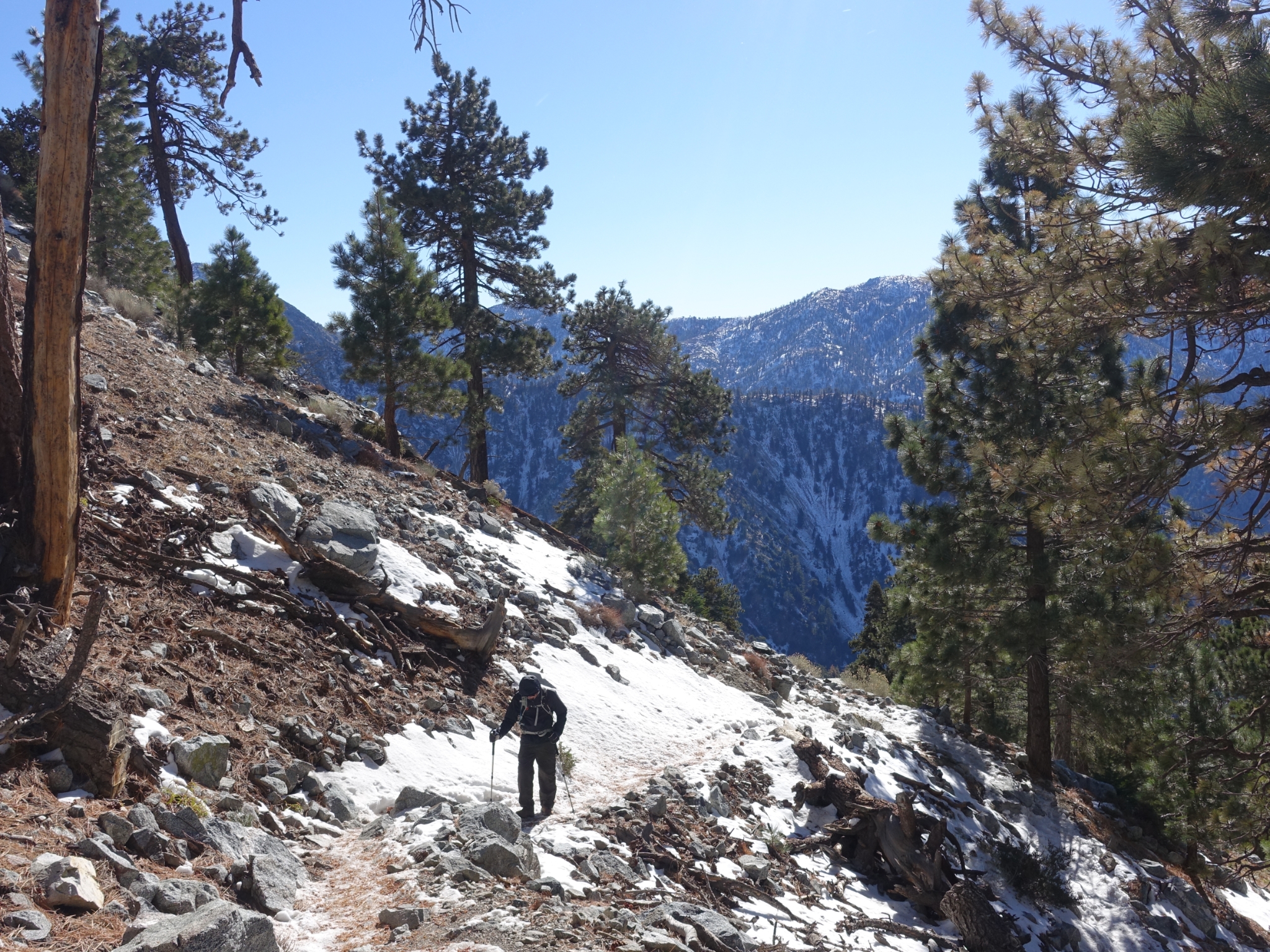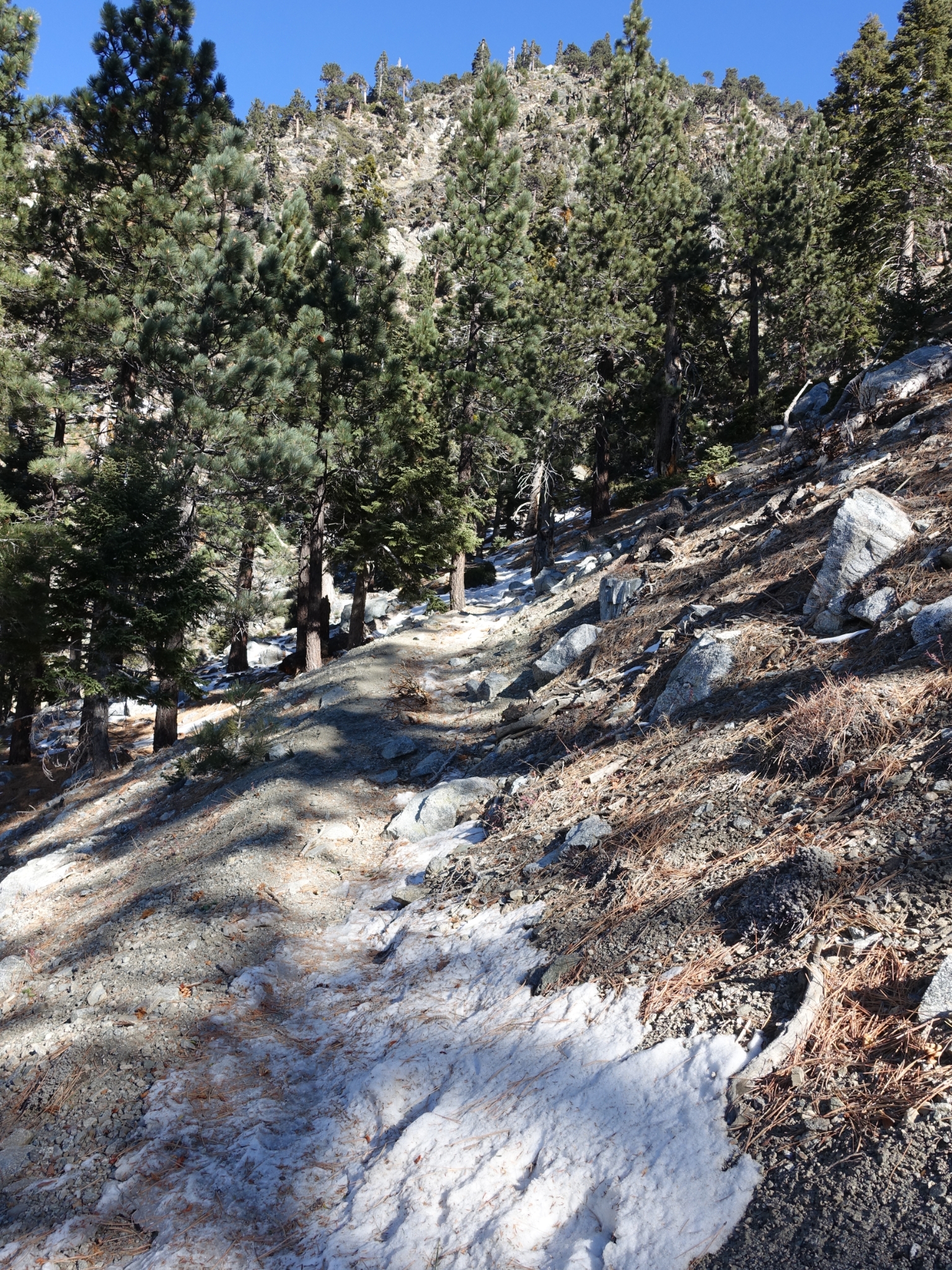 2 There had been a storm with a fair amount of snow the weekend before, but we didn't expect there to be much left. Yet we started hitting snow on the trail at just over 7,000'.