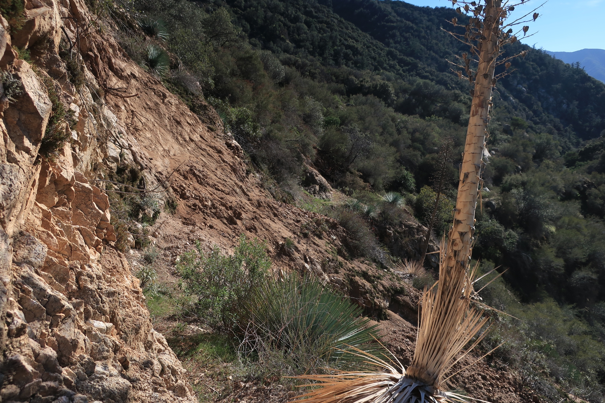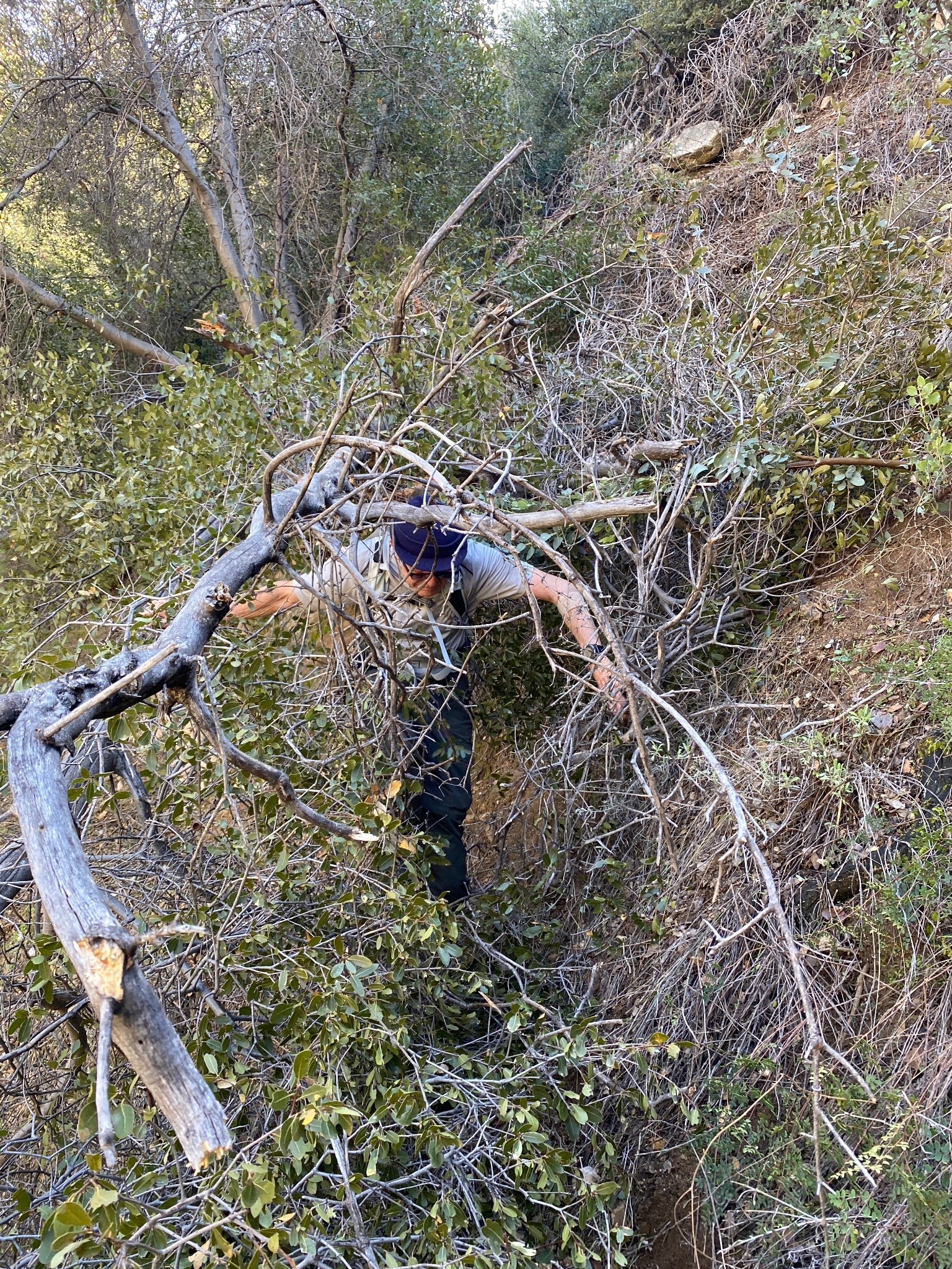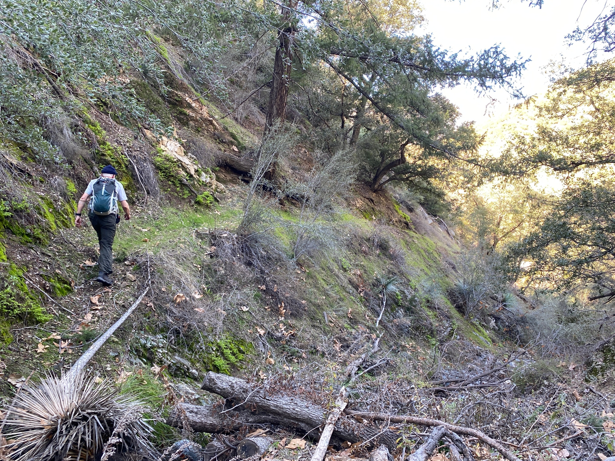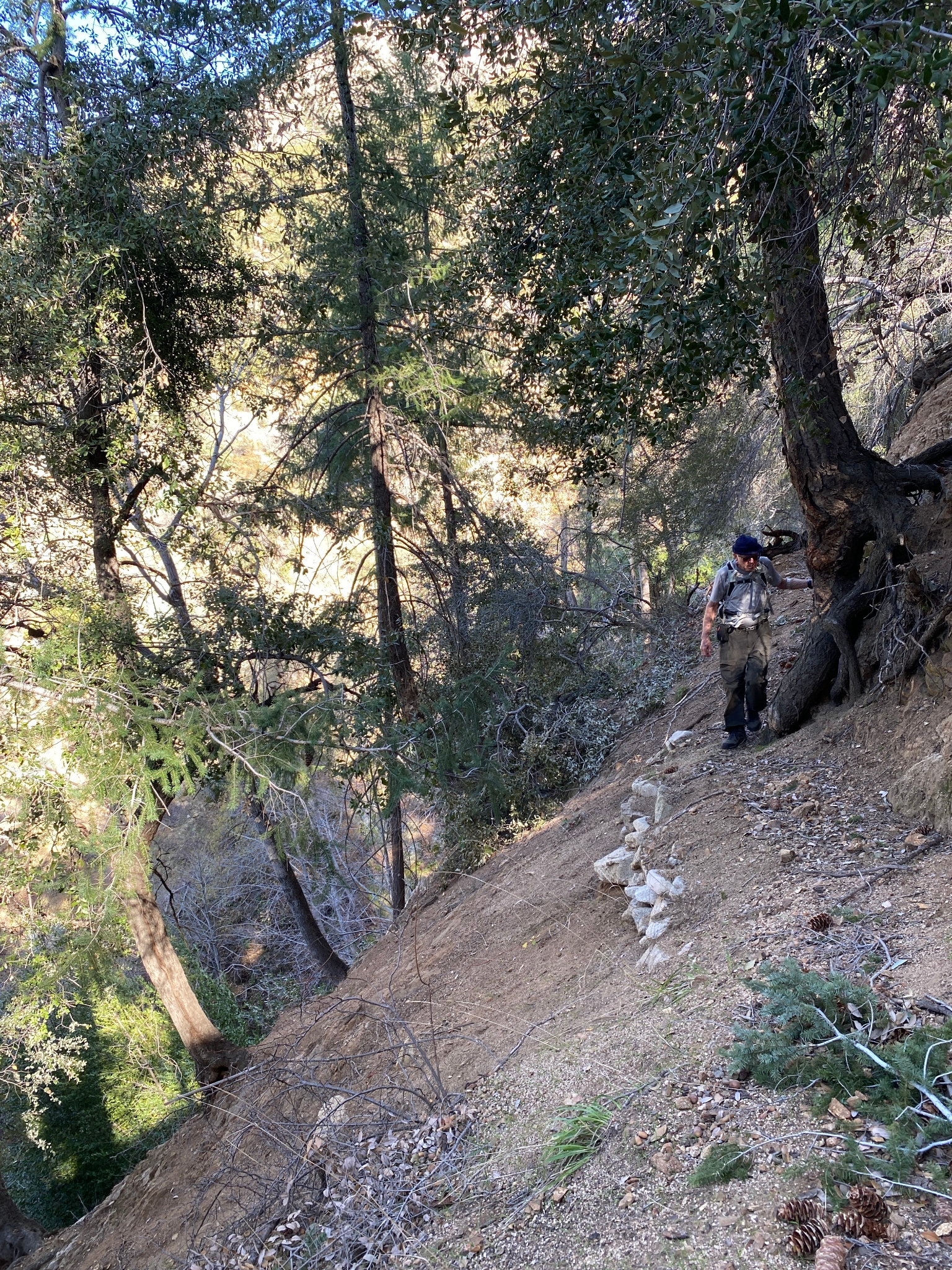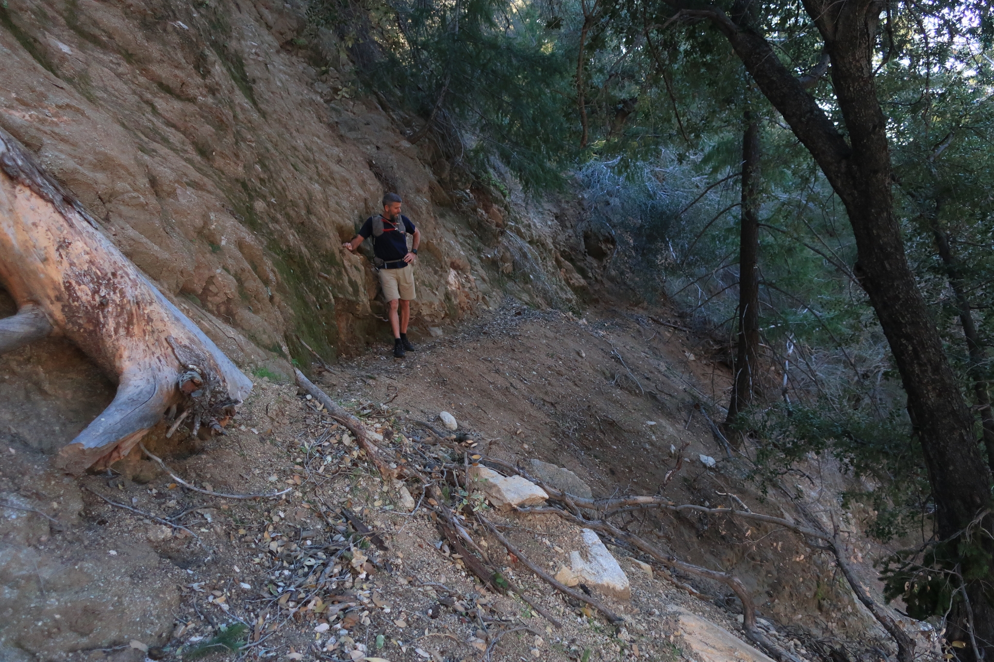 14 Almost down to the creek and we hit an area of trail that had been completely wiped-out by a small landslide. It's basically just loose sand with absolutely nothing to grab on to. Though it's probably less than 10ft across, there's just no way to safely get through it.