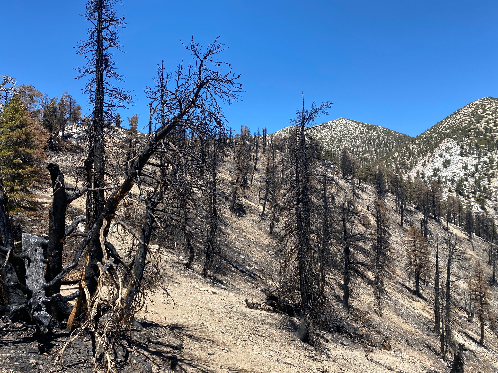 7 As the trail hits the ridge above High Creek camp, the first signs of the Apple Fire are clear. They must have set a firebreak on the top of the ridge, because one side is still green, while the other is charred.