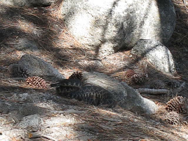 28 So, I'm walking down the trail in my end-of-day tortured zoned-out zombie state and a couple people coming up the trail ask "Did you see a big rattlesnake up there? Someone said to look out for it". I said "Nope, didn't see one". They continued up the trail, and not more than 30 feet up the trail, right where I had just walked, was a big rattler just off the side of the trail. It was mellow until they started talking and then it coiled up and got pissed. I was surprised how beefy it was.