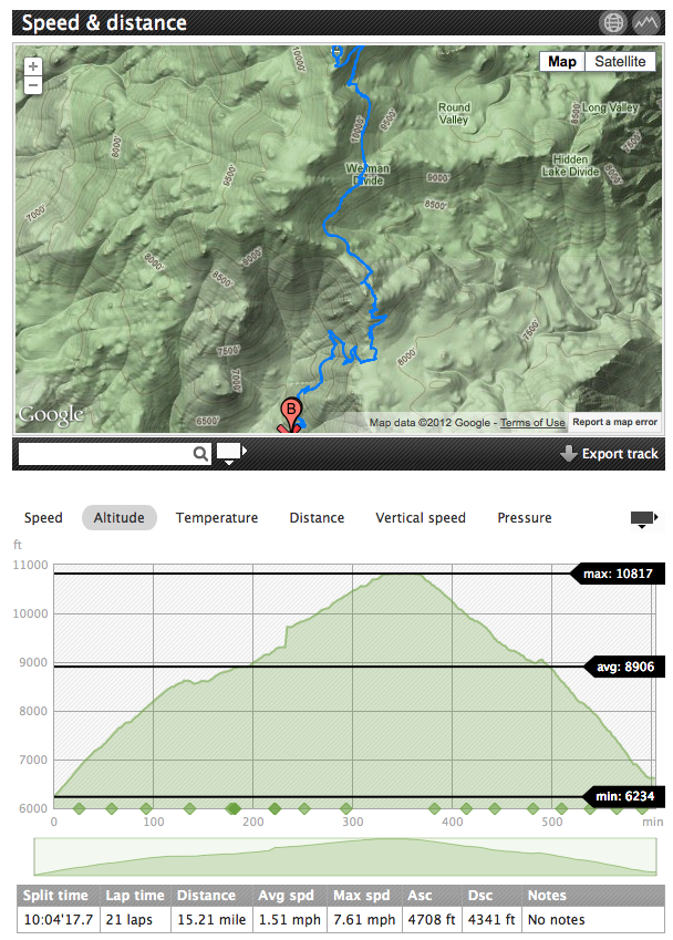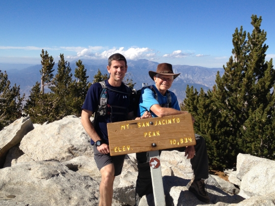10/7/12 Back to San Jacinto, this time with my Dad. We started at Humber Park, went up the Devil's Slide trail, through Wellman's Divide, and to the summit. Over 15 miles and 4,700' of gain on an early Fall day with perfect weather.