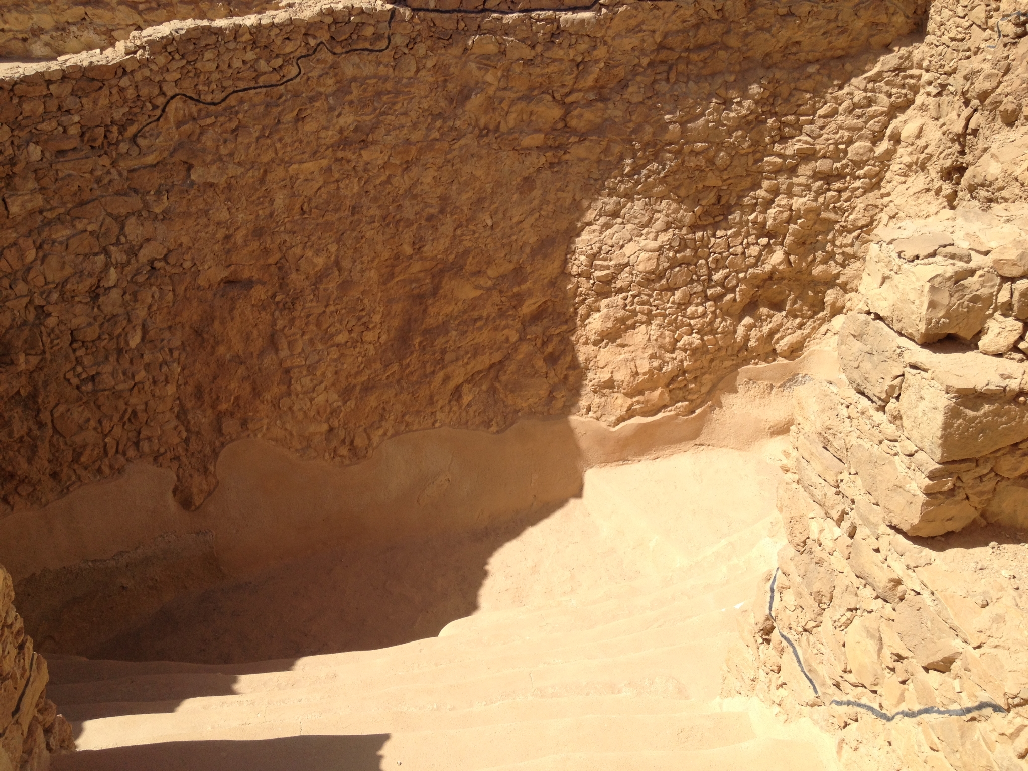 8 After the Jews fled Jerusalem in 70 CE, they settled at Masada. In 73 CE, the Romans laid seige to Masada to eliminate the last of the Jews. They encircled the entire mountain with a wall, which you can still see portions of here. They built multiple seige camps around the mountain. Here you can still clearly see the remains of the squared walls around one of the camps.