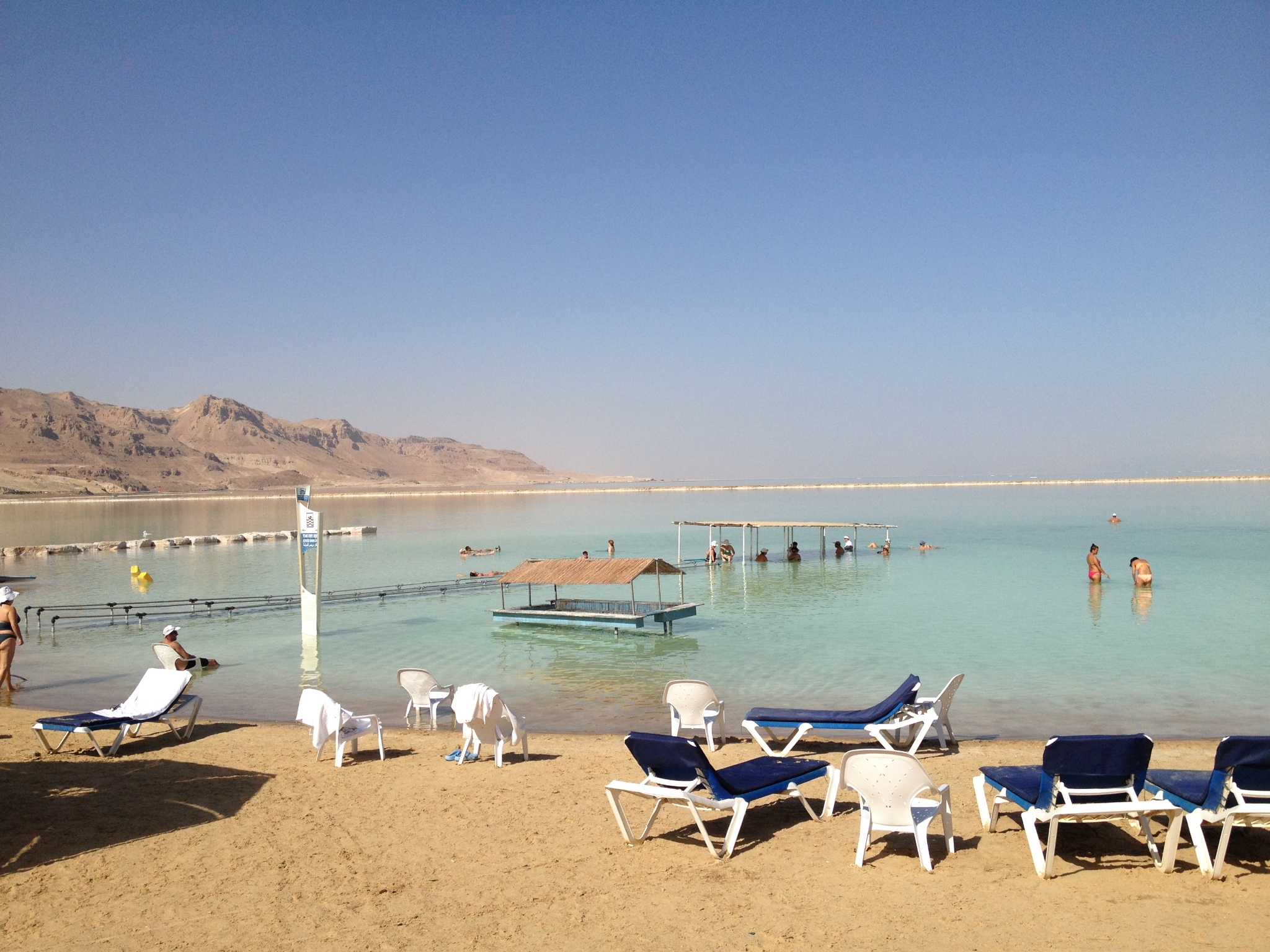 25 There are several resorts along the Southern end of the Dead Sea, which is over 31 miles long. The border between Israel and Jordan runs right down the middle of the Sea. Here you can see a ramp where we walked out into the Sea and then floated around for a while. You pretty much can't swim because it's so buoyant. And the slightest cut on your skin will sting like crazy!
