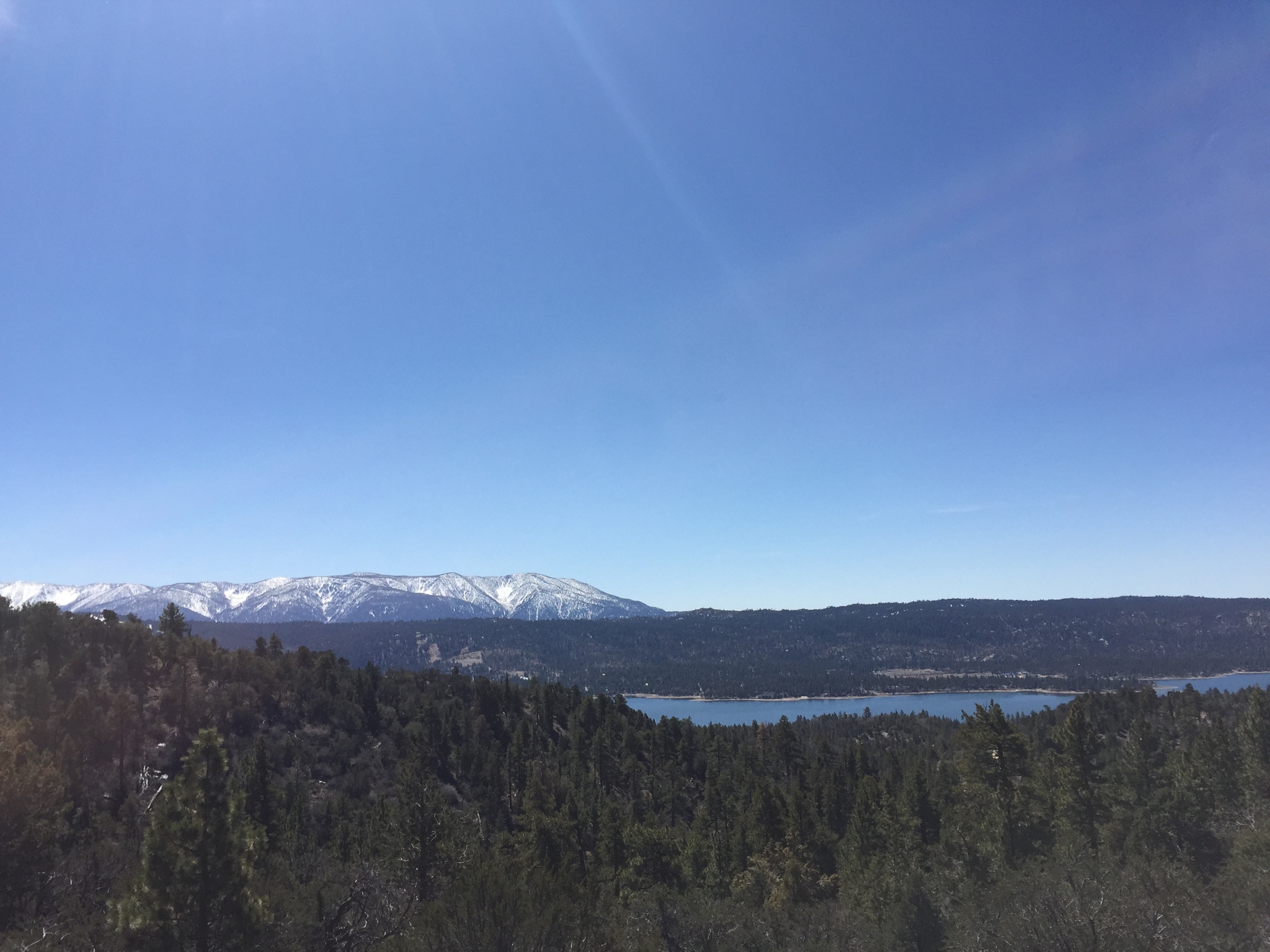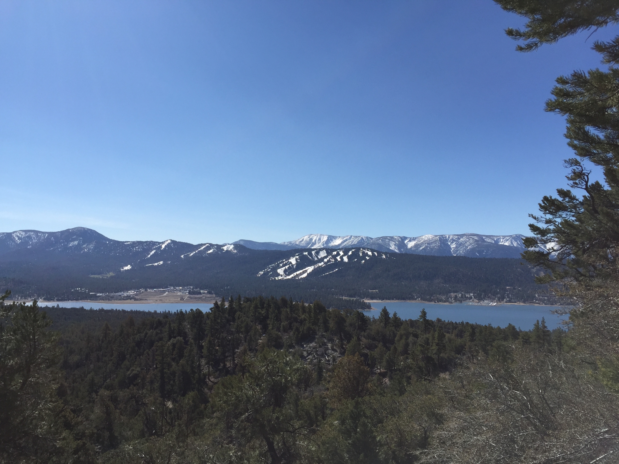 1 Up the Cougar Crest trail on the North shore of the lake. Here you can see the Snow Summit ski area (with man-made snow) on the South shore and then San Gorgonio in the distance (with real snow).