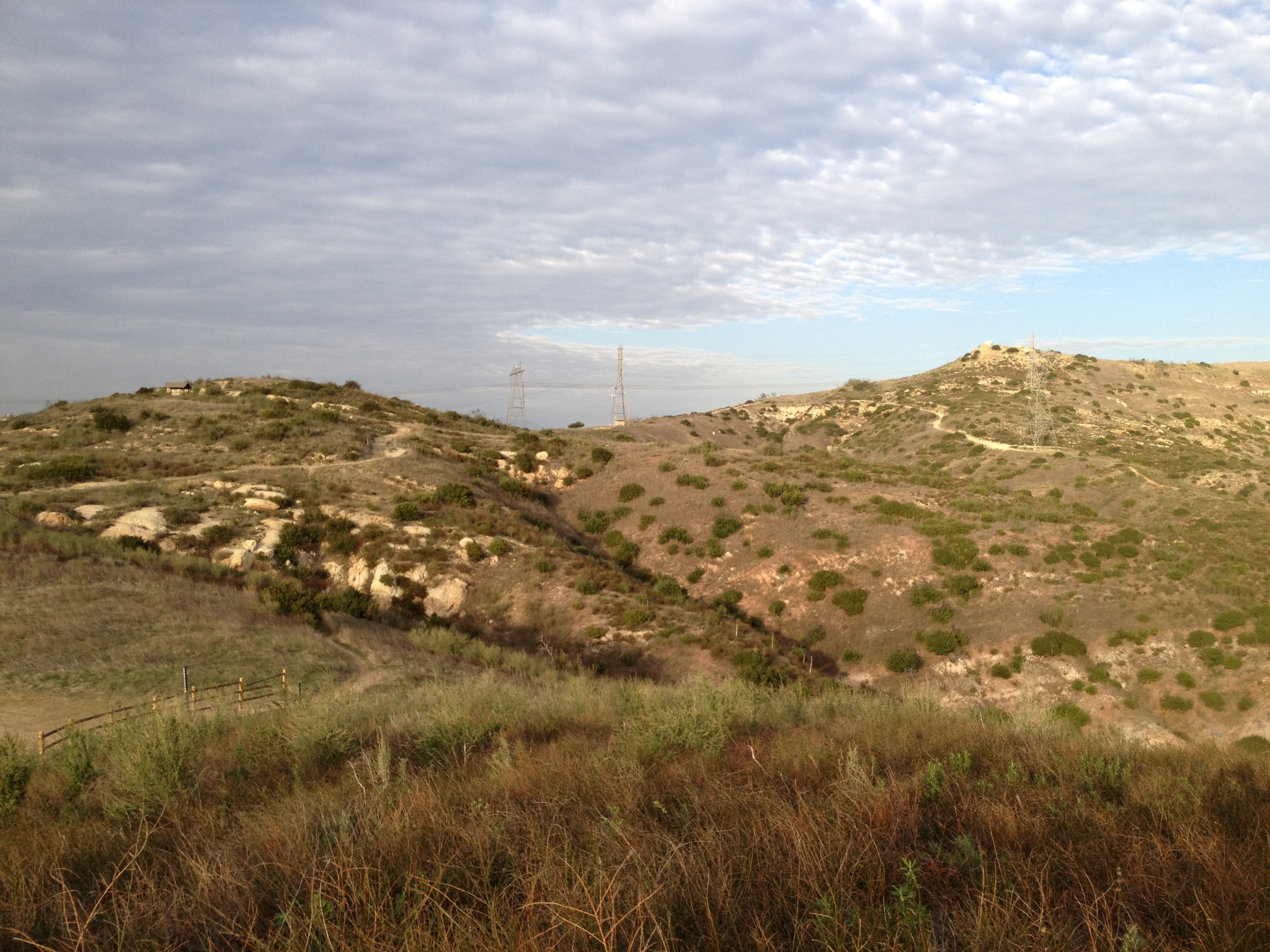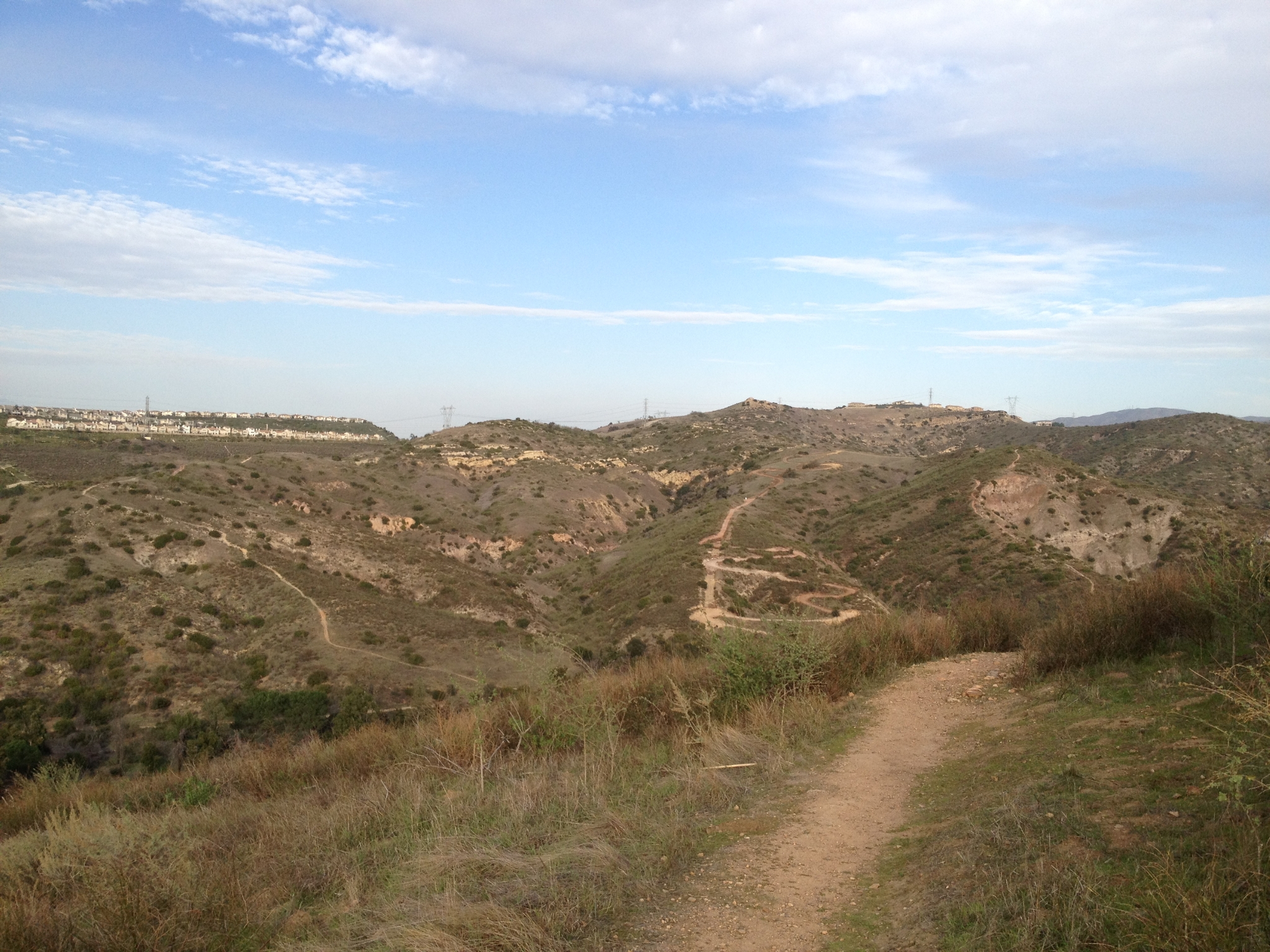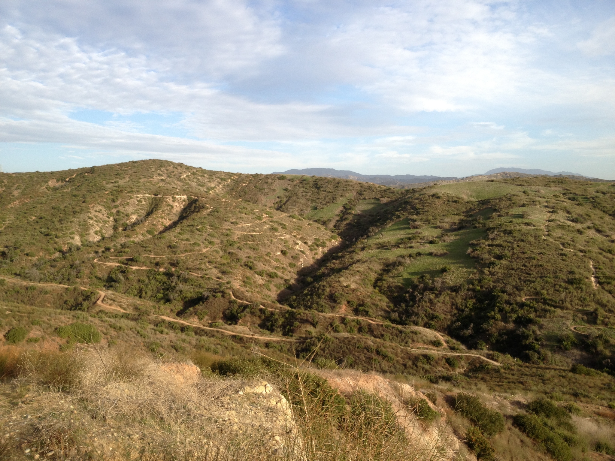 Not far from Peter's Canyon, Santiago Oaks is a great place for some steep, technical single-track. It's good for up to about 15 miles and 2500' of elevation gain. Unfortunately, most of the vegetation was destroyed in a huge fire a few years ago, but it's slowly but surely returning.
