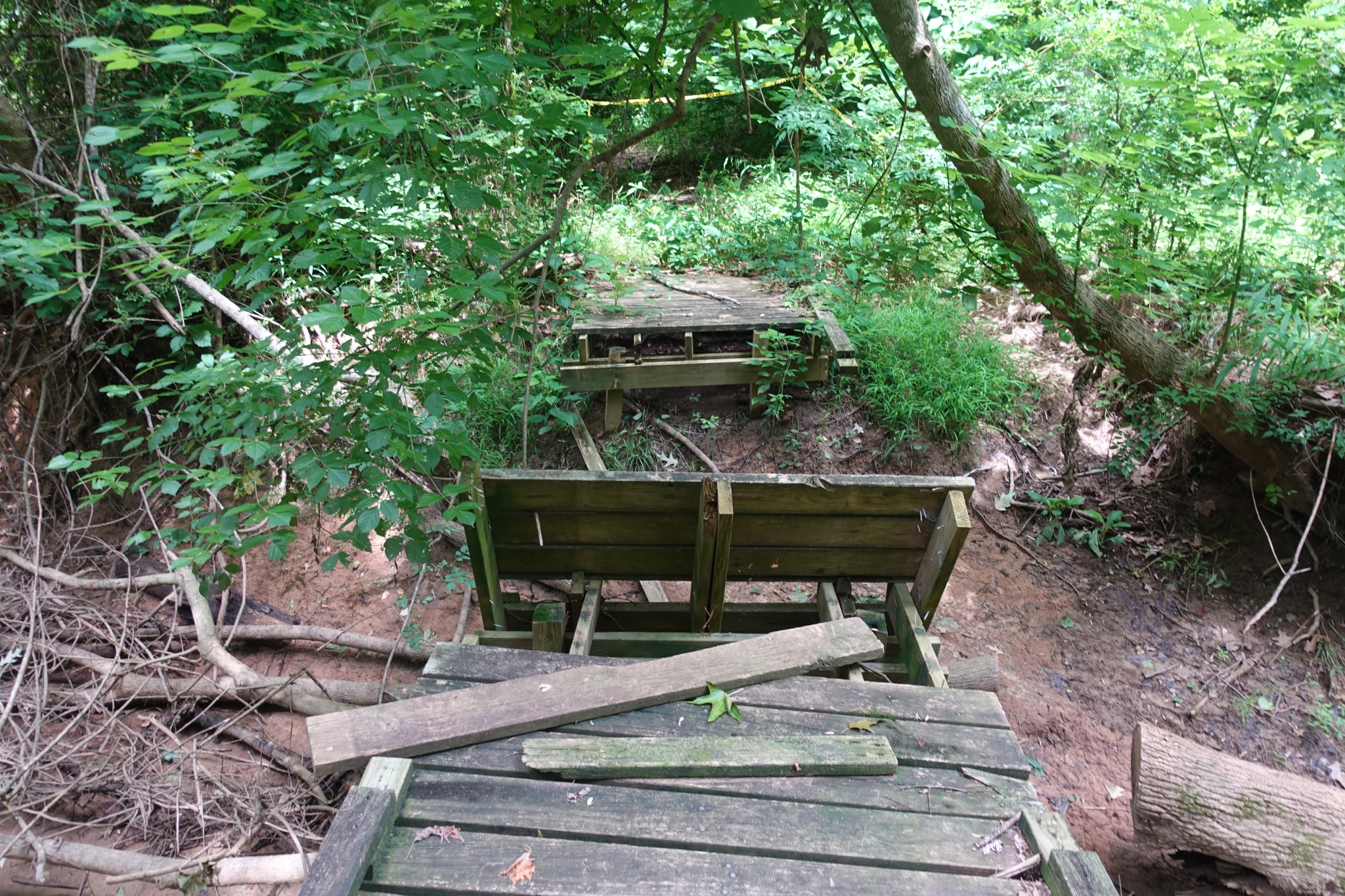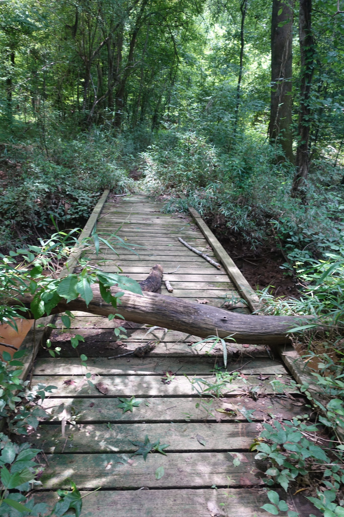 13 As you get further out around the loop, the trail gets more overgrown and less maintained. Here a bridge is out, and it's a good thing the creek isn't flowing too high.
