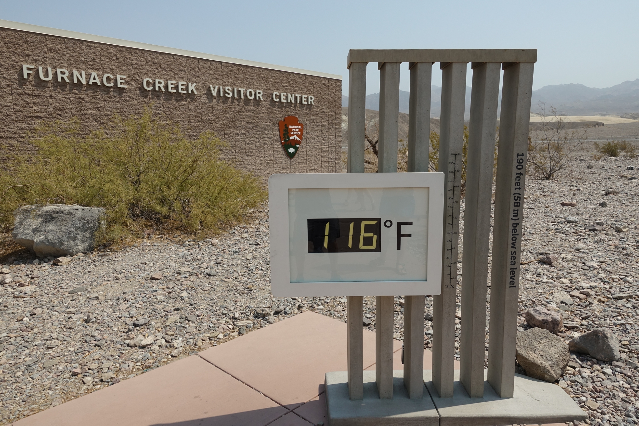 30 And then a little while later, a quick stop back at the Vistor Center, where the official temperature is now 127 degrees. Only 7 degrees off the world air temperature record of 134 degrees set here. Evidently the last two summers here have been the highest average temperature in history. For some reason, my mind stops processing temperature differences over 100 degrees. But going from 95 degrees to 127 is the same as going from 68 degrees to 100 degrees, and it really does feel like that big of a difference!
