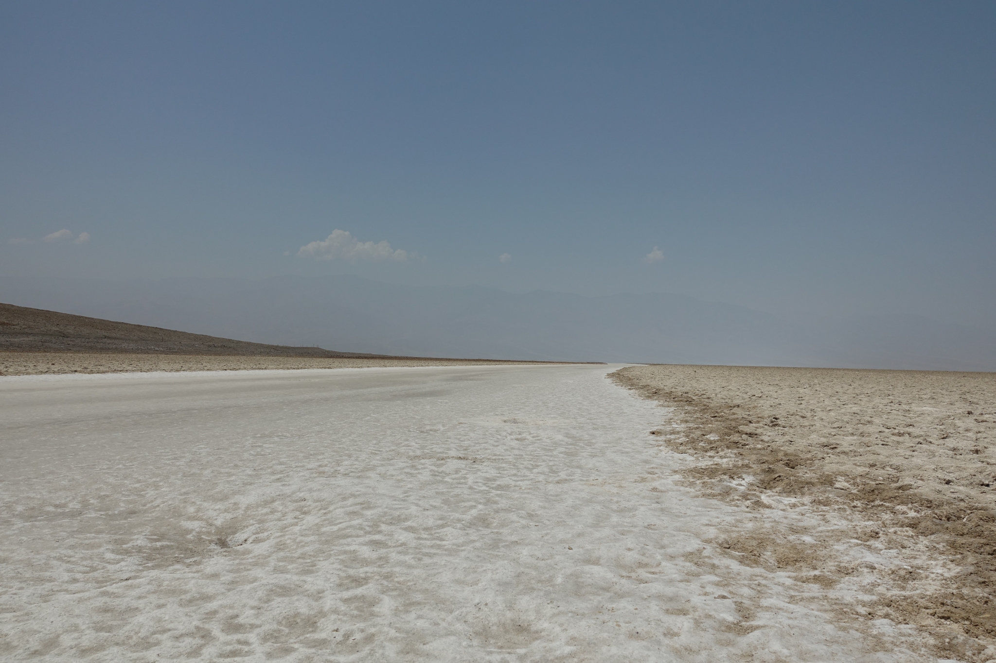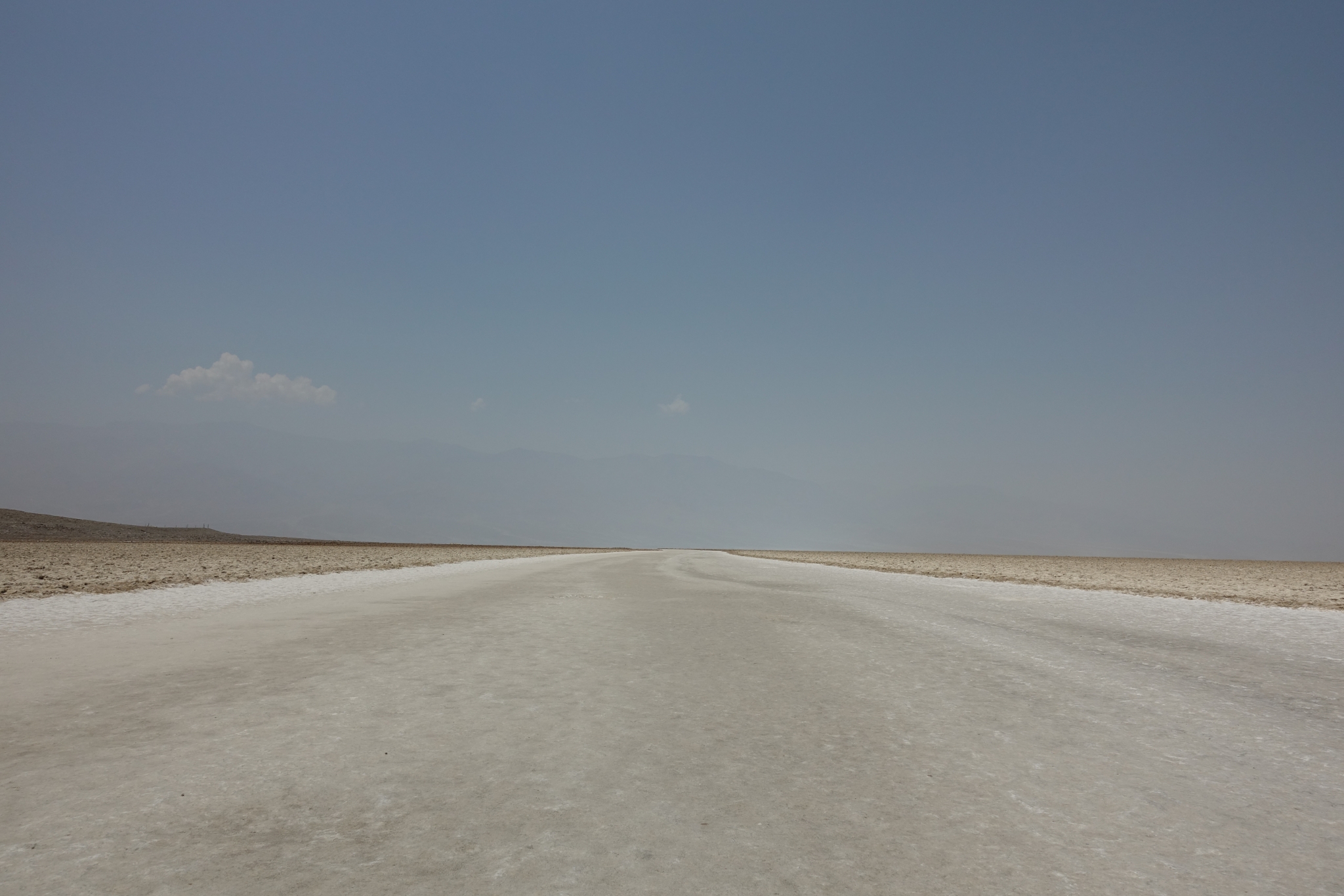 11 No, it's not a white paved road, it's part of the huge Badwater salt flat. The minerals get deposited here from flood waters that wash down the local mountains. The water forms temporary lakes that evaporate and then leave the minerals behind.