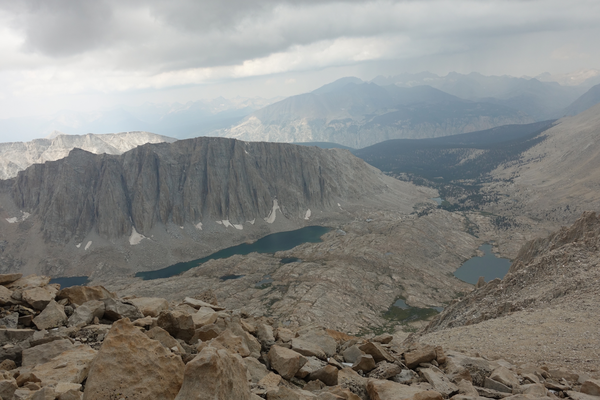 34 The view Southeast from Trail Crest. I decide I'm not going to let weather stop my 24hr challenge if at all possible, so I make a mad dash to the summit. I basically ran from Trail Crest to the summit, blowing by people, and not stopping for a single picture. The trail here is rugged and narrow with steep drop-offs covered in snow patches, so there was a limit to how fast I could go even at full speed.