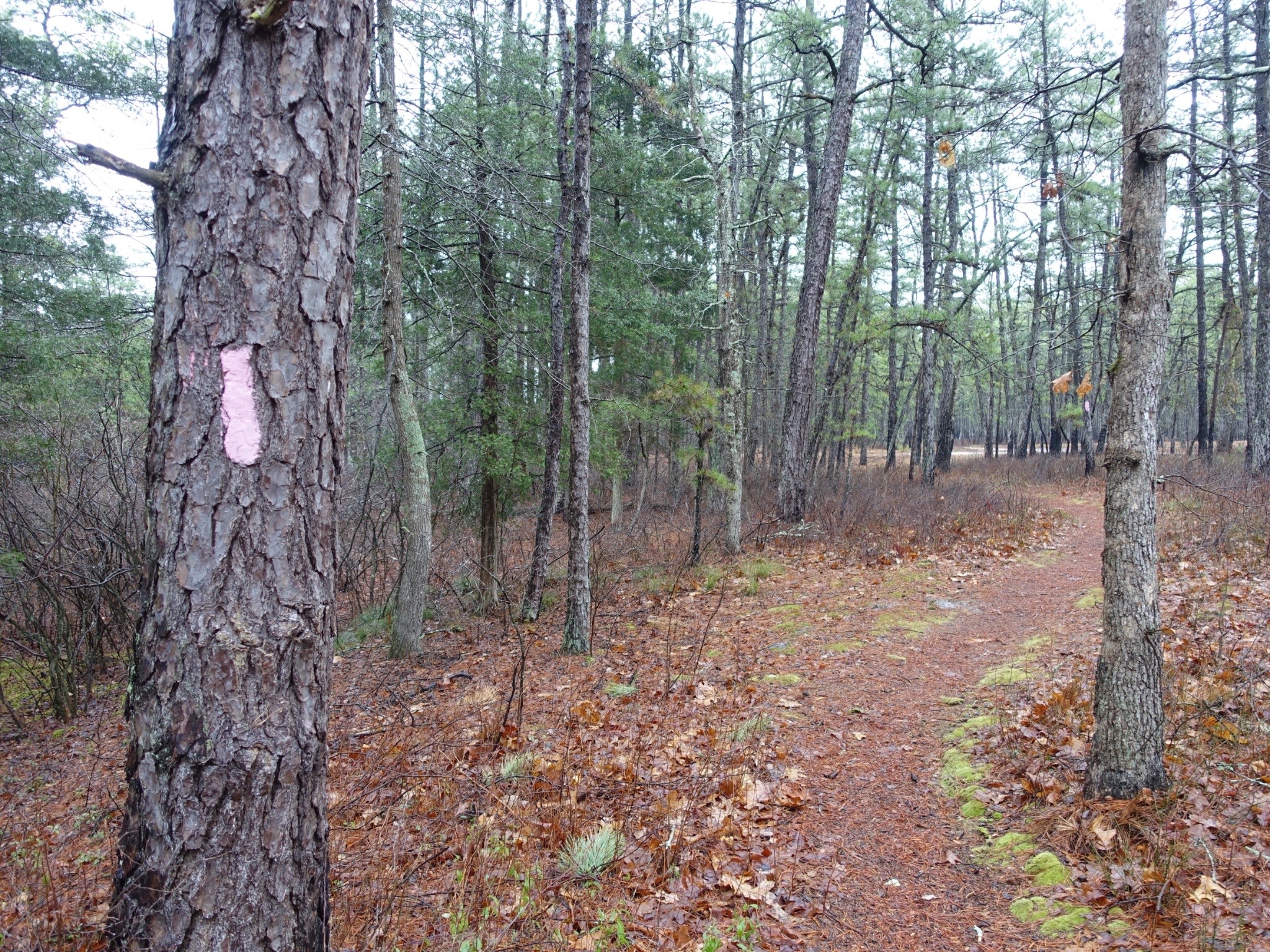 2 The Batona trail is marked prominently with pink blazes. Most of the trail systems around here (as with Europe) seem to rely on the blaze system of marking trails. And yes, that's where the term "trail blazing" comes from.