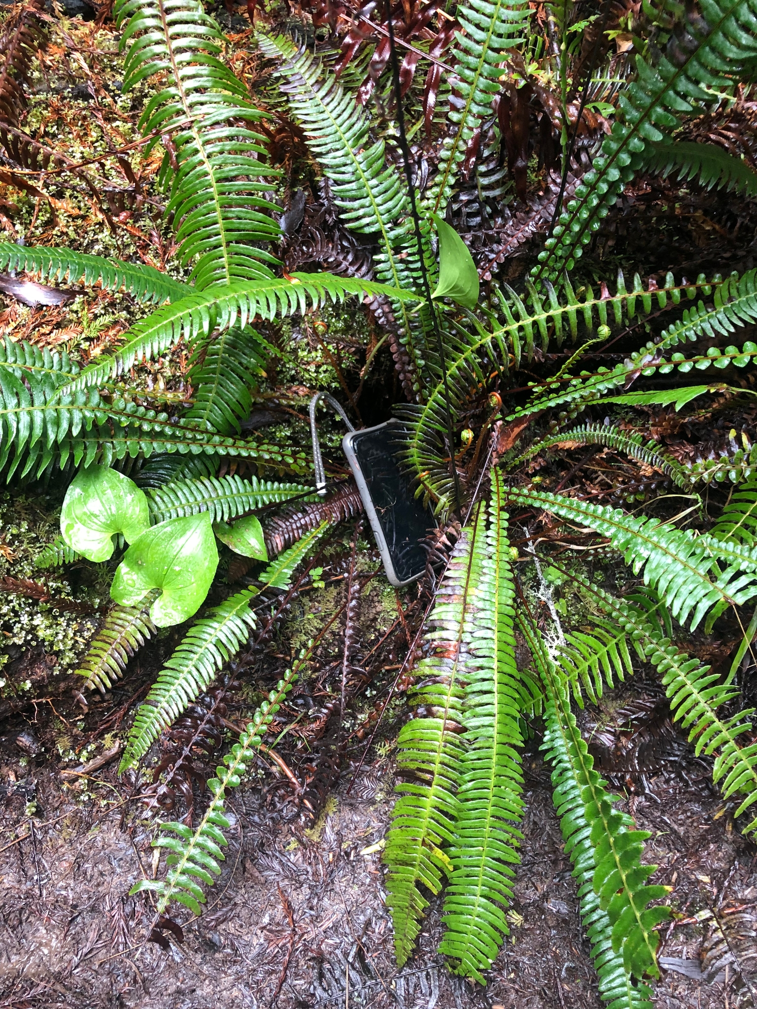 15 Me recreating where a tree snagged my backpack and flung the phone out into the ferns. After the adrenaline rush of losing and then finding the phone, it's time to carry on.