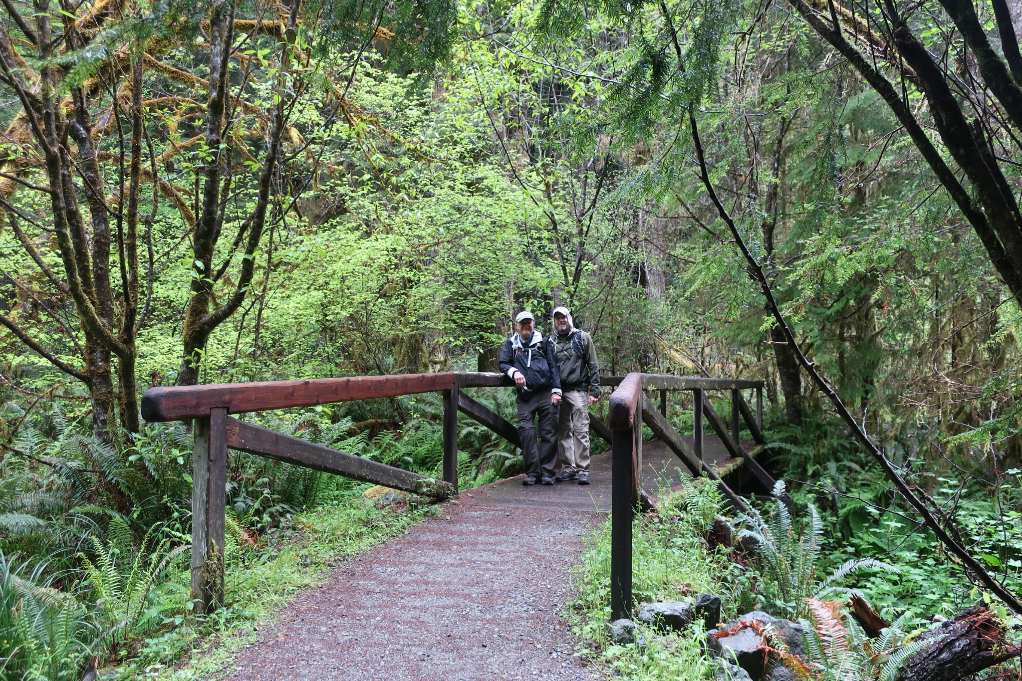 1Another hiker offers to take a photo for us. After yesterday's preview of the Redwoods, I was excited for today's hike. It did not disappoint. Here we found someone to snap a photo for us as we got started.