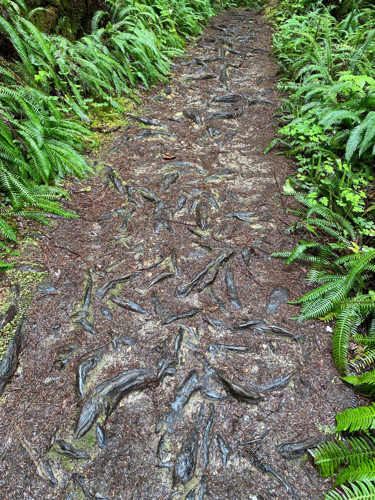 11 Coastal Redwood roots are not deep but spread wide. Here they create an interesting pattern on the trail.