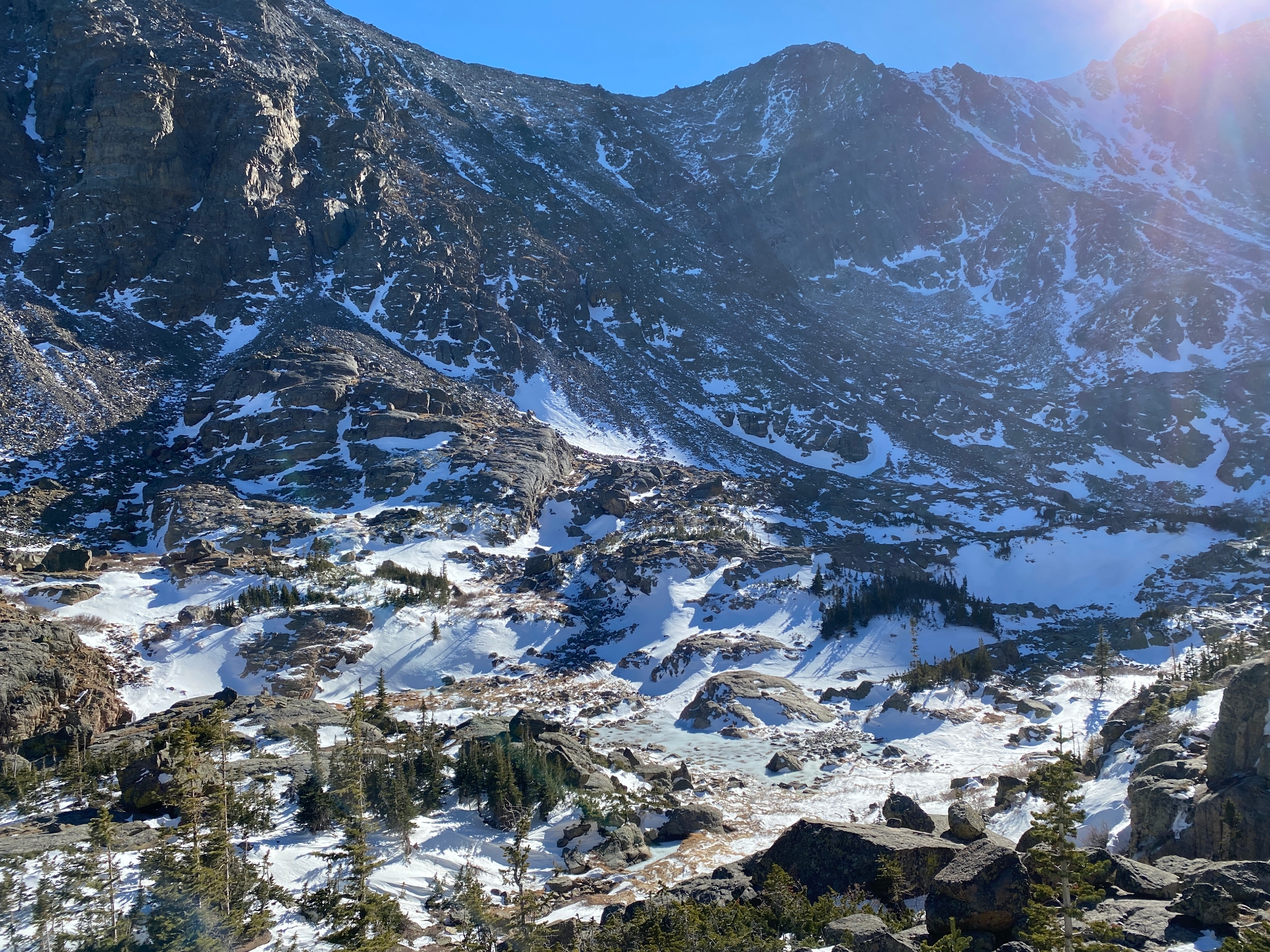 1 After making the almost 2 hour drive up from Denver, I was ready to get started at the Glacier Gorge trailhead. An extremely dry winter so far meant that there was much less snow than normal. It was a chilly but perfect morning.