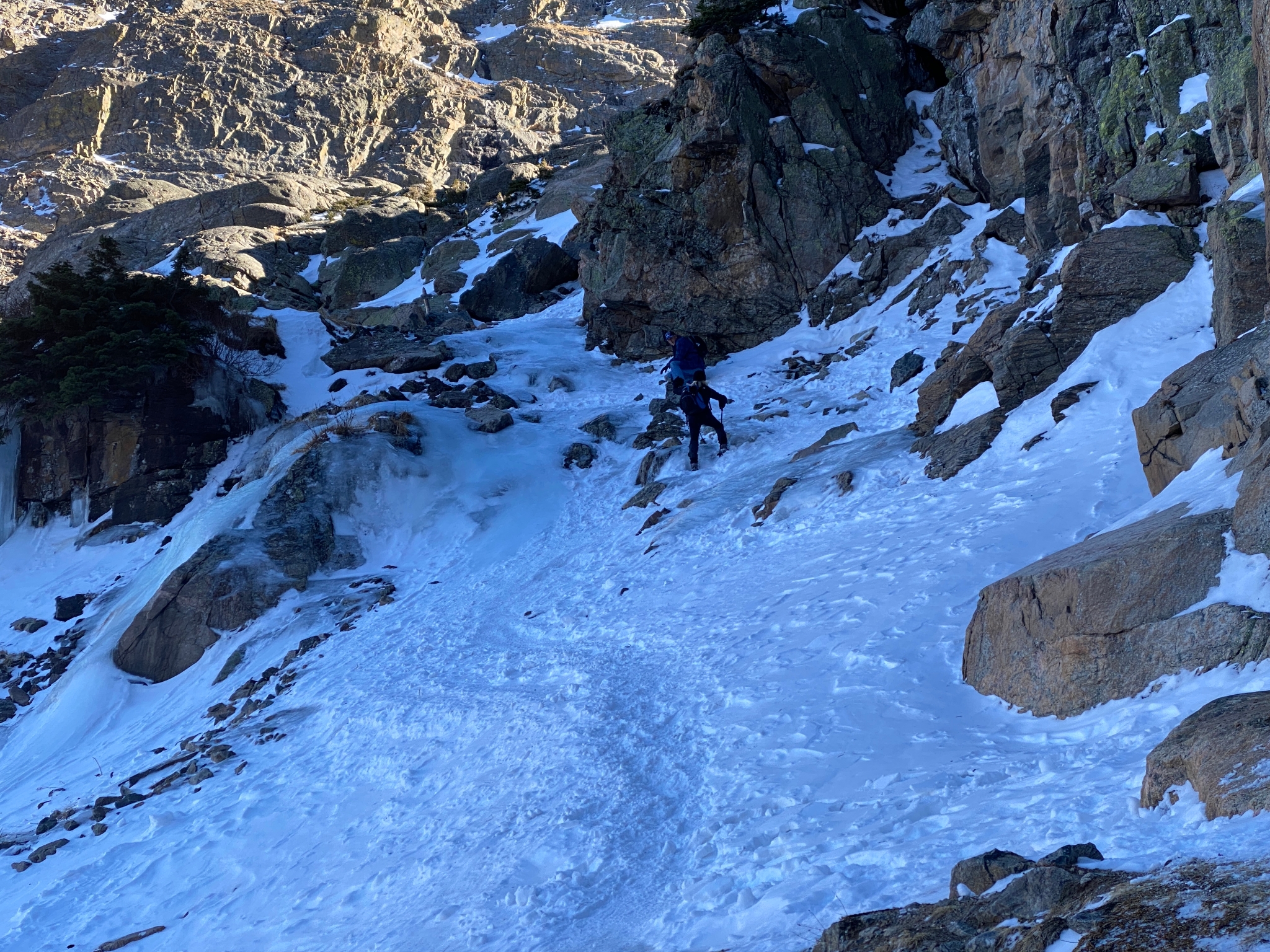 23 After a nerve wracking descent, I finally made it down. A couple others passed me heading up. Here they're just about to hit the very bottom of the icy section. At least they have spikes, I was the only one I saw all day without them.