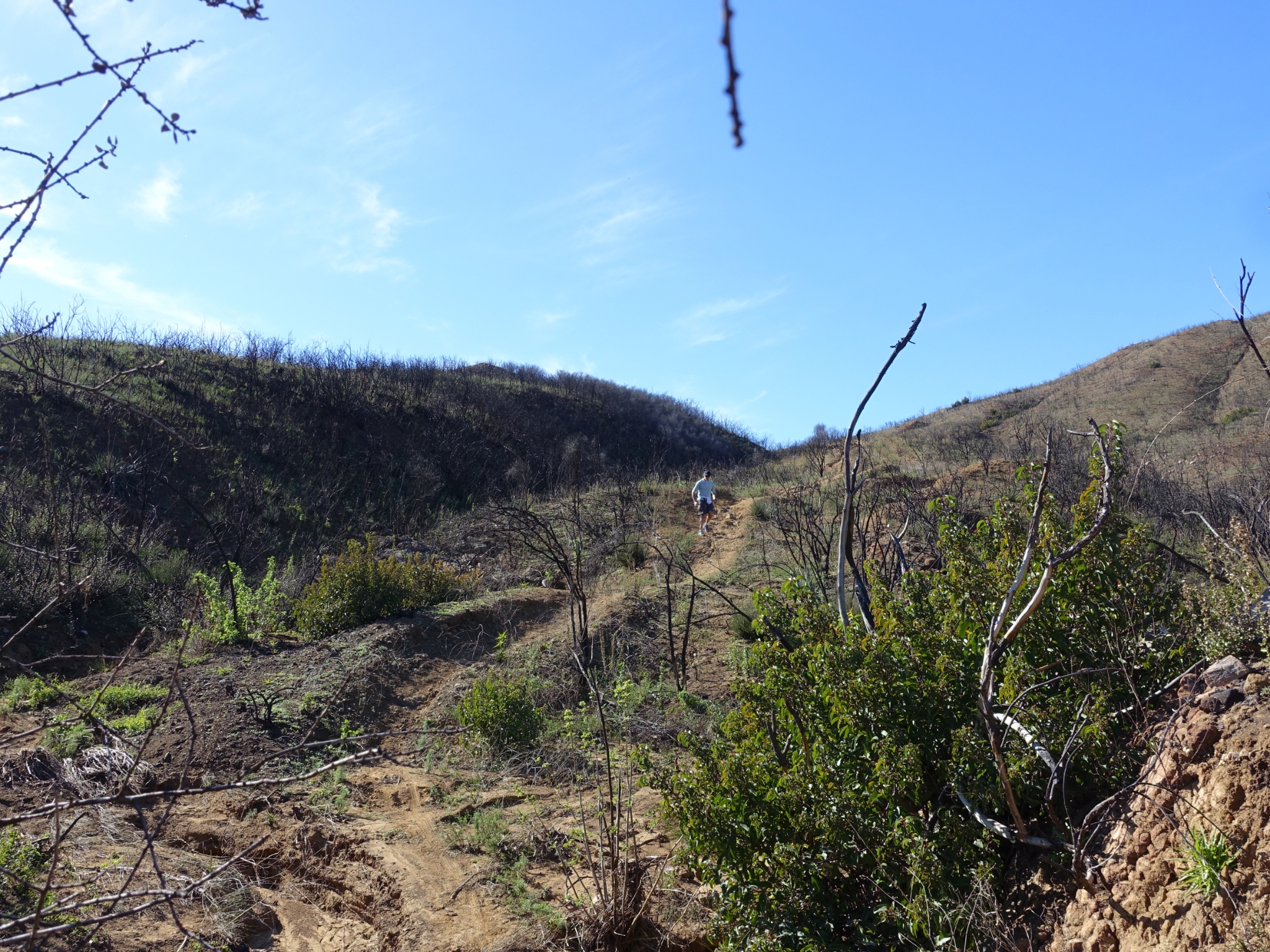 1 The plan was to run the same route as the Xterra race course. I thought for sure that between the trail map, and memory, I would be able to retrace the course. But the area had been completely wiped out by the Pt. Mugu fires from a couple years ago, and then recent heavy rains had washed everything out. The entire park was closed, but that didn't stop Dr. Rock and I from heading on. Here's the bridge at the end of the road that used to be in heavy tree cover.
