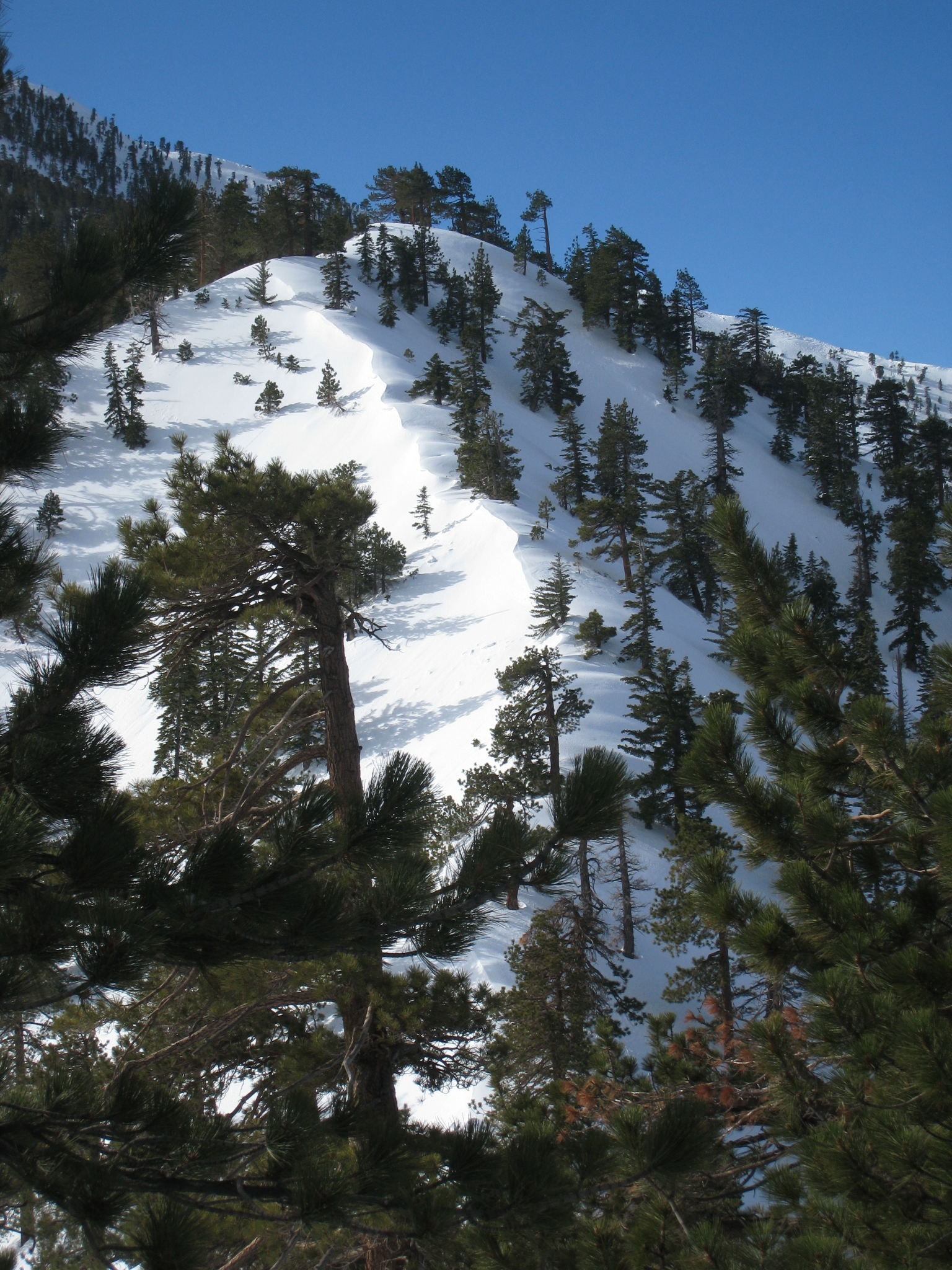 1 I had been wanting to try some mountain trail snowshoeing. Not walking around on a nice, flat, snow-covered meadow, but rather the same steep mountain trails I would hike in the summer. So, I did my research, bought my snowshoes, and picked a trail. I decided on the Acorn and Backbone trail to Pine Mtn. at Mt. Baldy because I knew it well and had already tried it in light snow. Sounded like a rational decision, but that trail is also one of the steepest and hardest trails I have ever been on, hiking, trail running, or otherwise. Turns out, that's not the best type of trail for your first time snowshoeing. But hey, if it's worth doing, might as well as do it all out! I didn't get home the night before until 10:00pm. I packed and was in bed by about midnight, was up at 4:00am, out the door by 5:00am, and was on the trail by 7:08am. So, away we go...