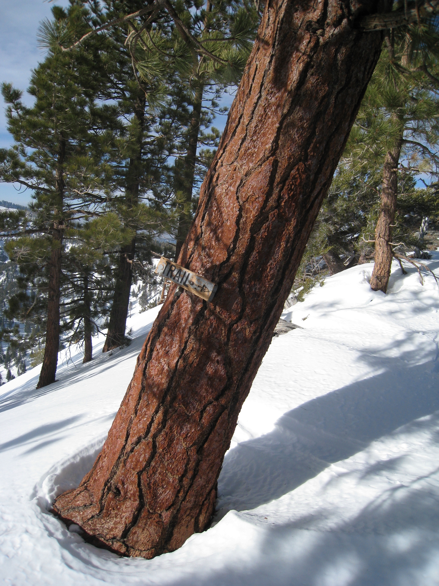 18 Coming down over the other side of Pine Mtn., I had my first major butt skiing incident. Basically you lose traction going down a steep decline, end-up on your ass, and then are in a completely uncontrolled slide down the hill. Arms and legs flailing. Trying to stop yourself with poles, snowshoes, anything. Nothing to stop your slide. On this particular wipeout, I was able to steer myself towards a tree so that I could do a controlled crash into it and finally come to a stop.