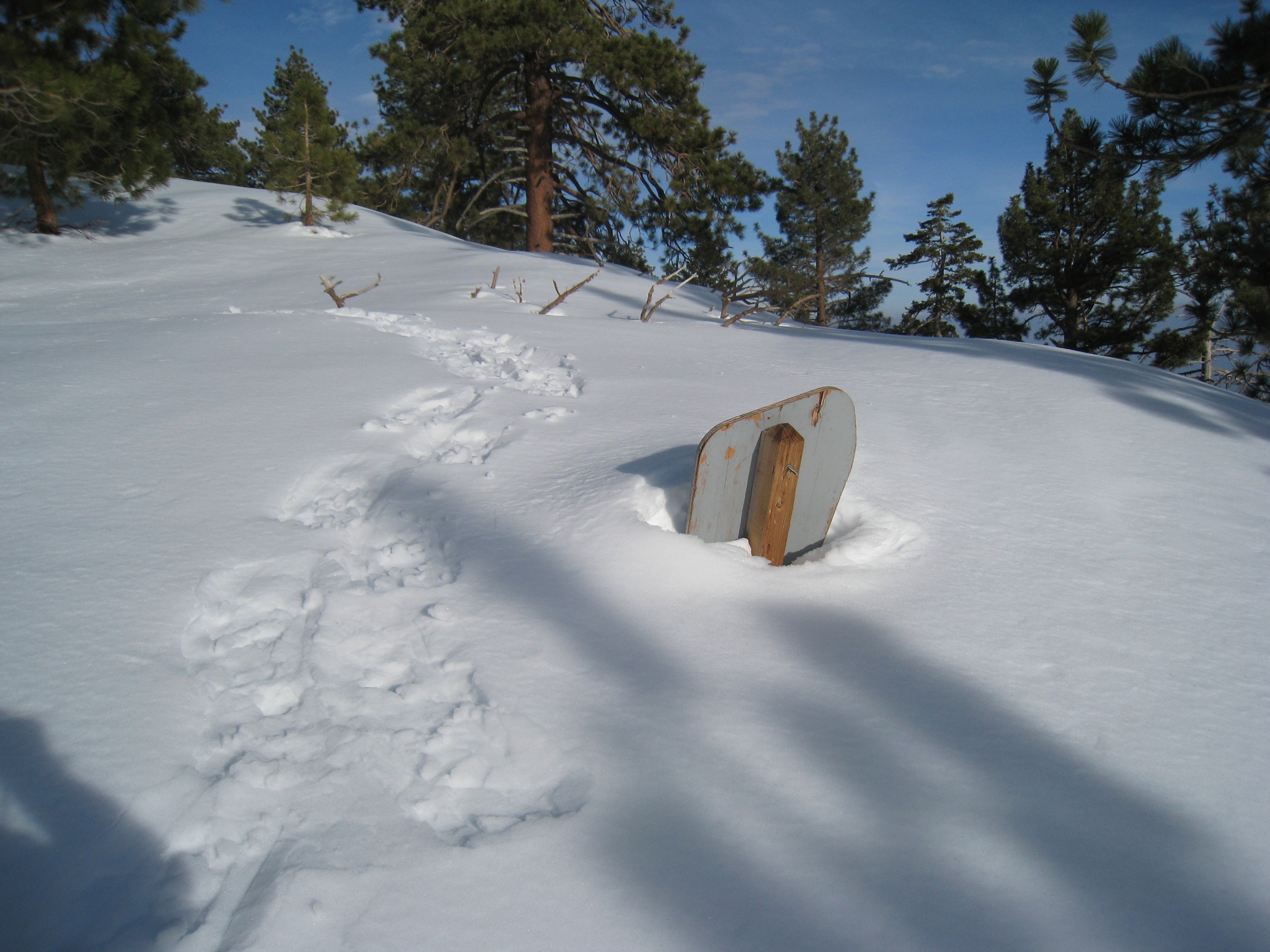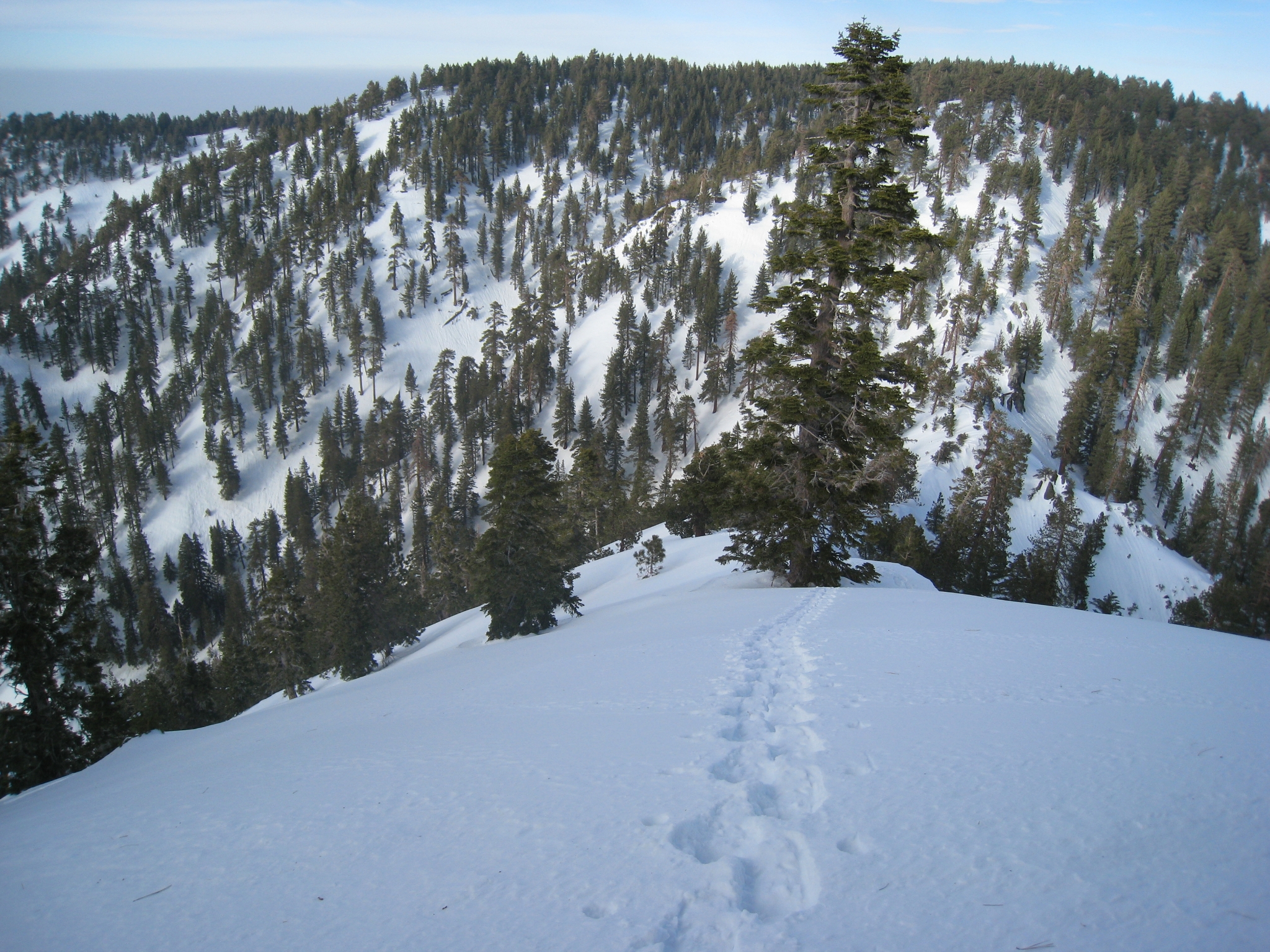 8 The fireroad at the top of the Acorn trail running parrallel to the PCT. Looks a little different than last time I was here! The previous snowshoer didn't go past this point, so it is 100% virgin snow from here on out. Turns out, that makes things really, really hard. Normally you snowshoe with 2 or more people so that you can take turns "breaking" the trail. The first person in line makes the snowshoe prints, then everyone else follows in his/her tracks. When the person in front gets tired, you rotate. I'm all alone, with no tracks from here on out, so I'm breaking my own trail the rest of the way! But it is kind of cool knowing that not a single human being has been here in at least 5 days (the last snow was Tuesday and it is now Sunday with not a single footprint in sight).