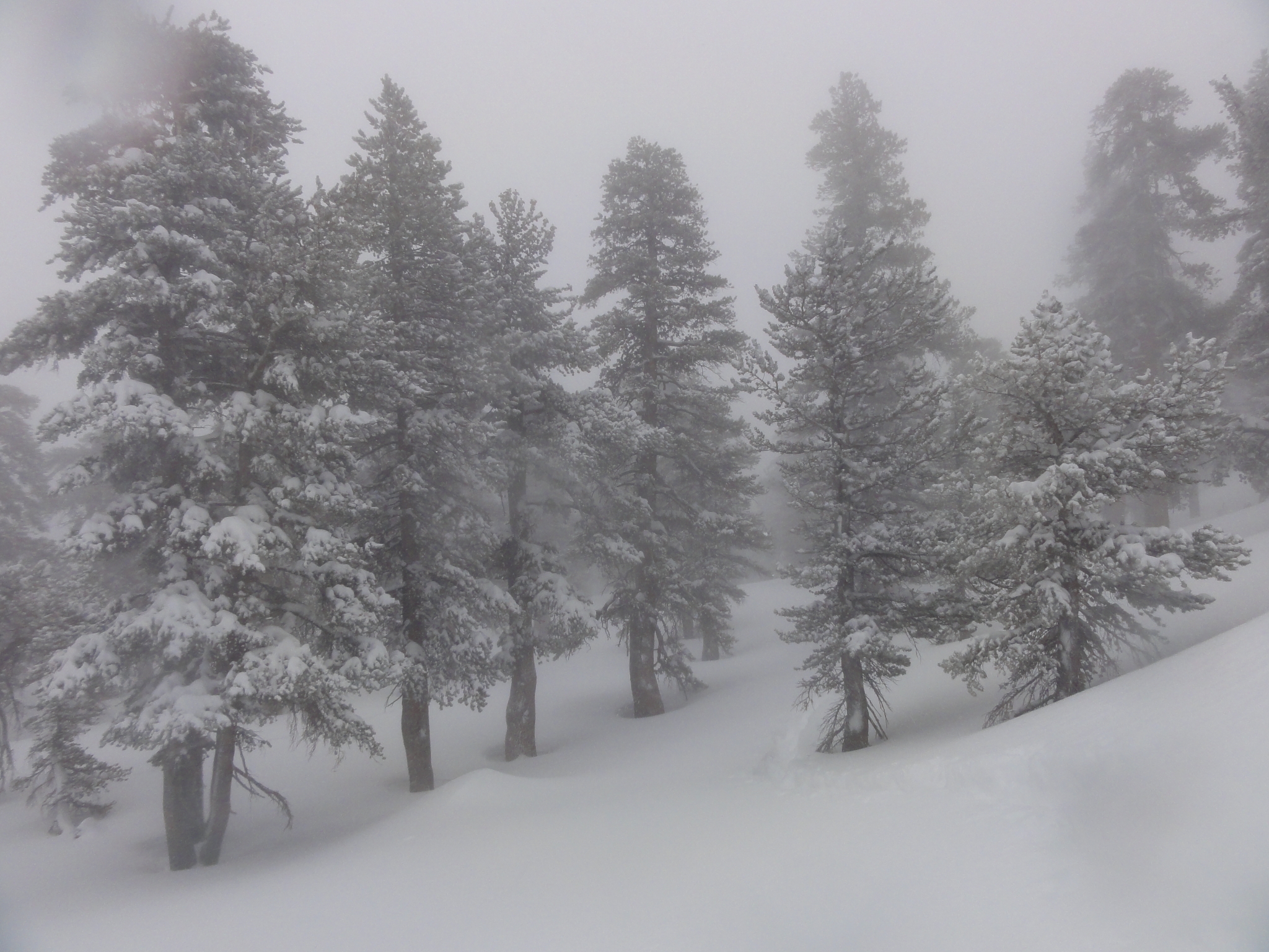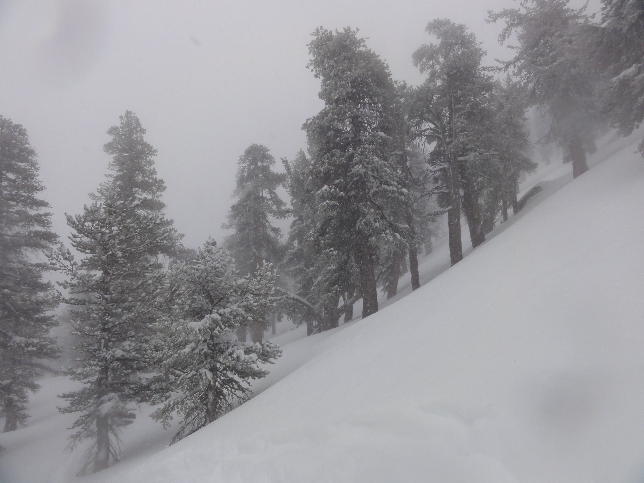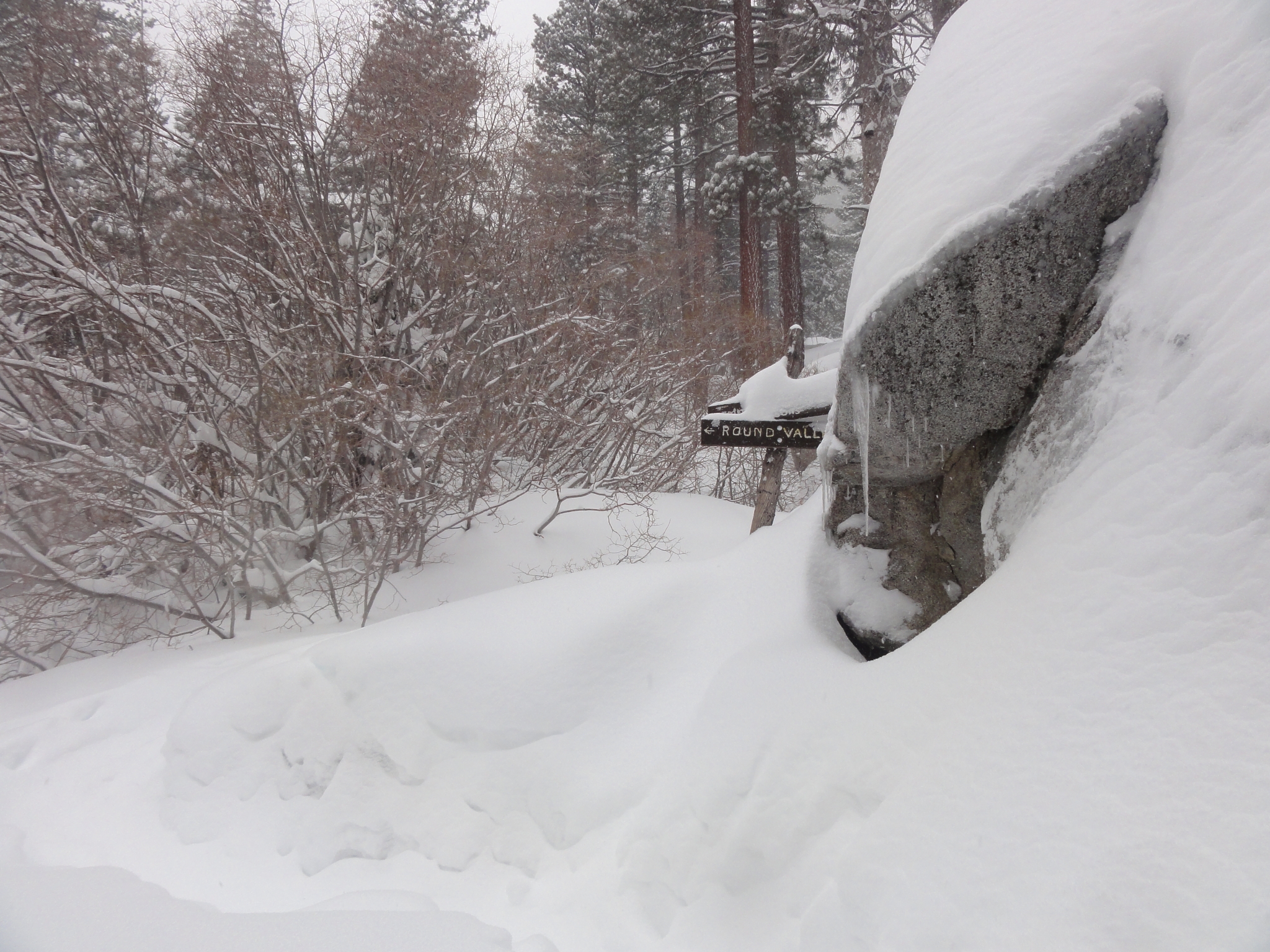 6 As I approached Jean Peak, things get steeper, and the powder got deeper. In places, I was post holing knee deep even with snow shoes on. I have never seen powder this dry and airy before in Southern CA (where the snow is normally pretty wet and packs quickly). In a couple spots, I wandered into a snow bank of waist deep powder, couldn't lift the snow shoes out, and had to slowly wade, as if through quick sand, until I reached a shallow spot. Another time, I fell face first into a snow drift and was completely submerged in snow, like being underwater. A new, and rather unerving, experience for me.