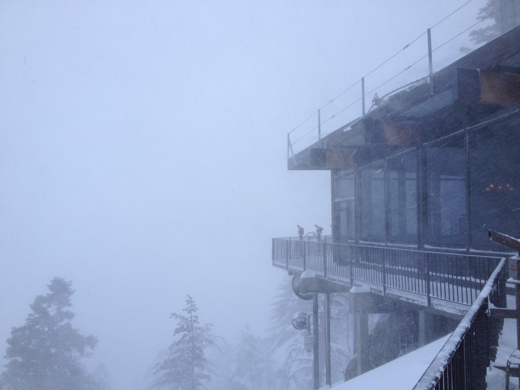 17 The view from the lodge balcony. Definitely not the normal clear view of Palm Springs. After eating a huge dinner in the lodge, I headed back down the tram with another snow day successfully completed.